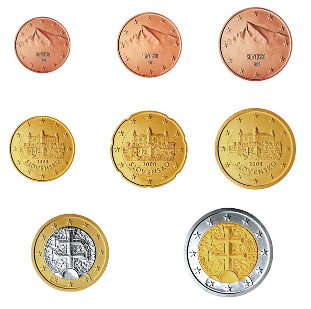 - 1, 2 and 5 cent: Tatra mountain peak, Krivan, important site for the awaking of the Slovak national conscience. 'SLOVENSKO' is below mid-center - 10, 20, 50 cent: Bratislava castle, the state emblem of Slovakia. 'SLOVENSKO' is at the bottom-center - 1 et 2 euro: the double cross in the middle of three hills, cross which appears on the national flag. The cross is sustained by the hills in order to express the stability. 'SLOVENSKO' is at the bottom-right corner, along the edge of the inner circle