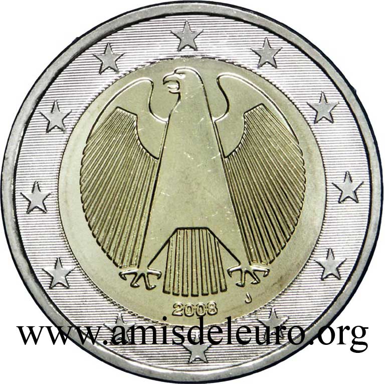 L’allemand est une langue indo-européenne du groupe germanique (qui comprend aussi l’anglais). On distingue en général le haut-allemand parlé au nord du bas-allemand parlé aussi en Autriche. Germany and the Euro No problem to qualify and introduce the euro, even after the reunification! Germany was the first country to test simultaneity between the introduction of the Euro and the withdrawal of the DM. At this time, this choice seemed too much risky because of the German money supply. - A : Staatliche Münze Berlin of Berlin The minting workshop of Berlin flatters itself for producing coins since 1280. It is not use that the engravers sign their works. The quality of minting is excellent for the five workshops and the FDC state can be quoted. The name of Germany does not appear on any of the circulating Euro coins, contrary to what stipulates the first article of the Official Journal of the European Commission n°2009/23/CE (in French). Let us finally note that Germany was the first country announcing that it would use in 2007 the new European reverse.