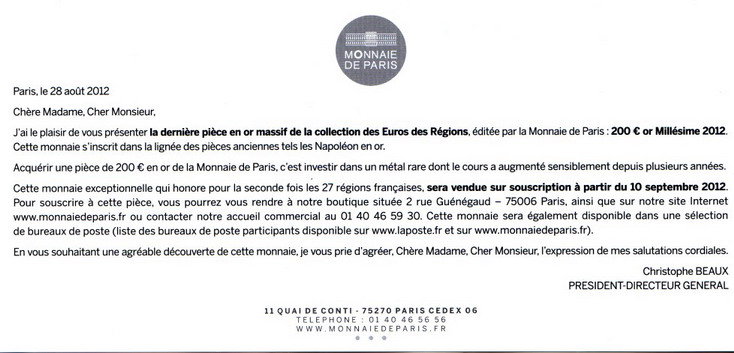 Je suis d'accord avec vous. La pièce est effectivement très cher d'autant plus que la collection est impossible puisqu'en 2010 il n'en existe pas et en 2012 le tirage des 10 euros Régions a été prévu pour un minimum de 70000 séries et que les 200 euros a été prévu pour 50000. Où est l'erreur? Malgré tout cela , je vais l'acheter seulement car la valeur faciale est garantie.