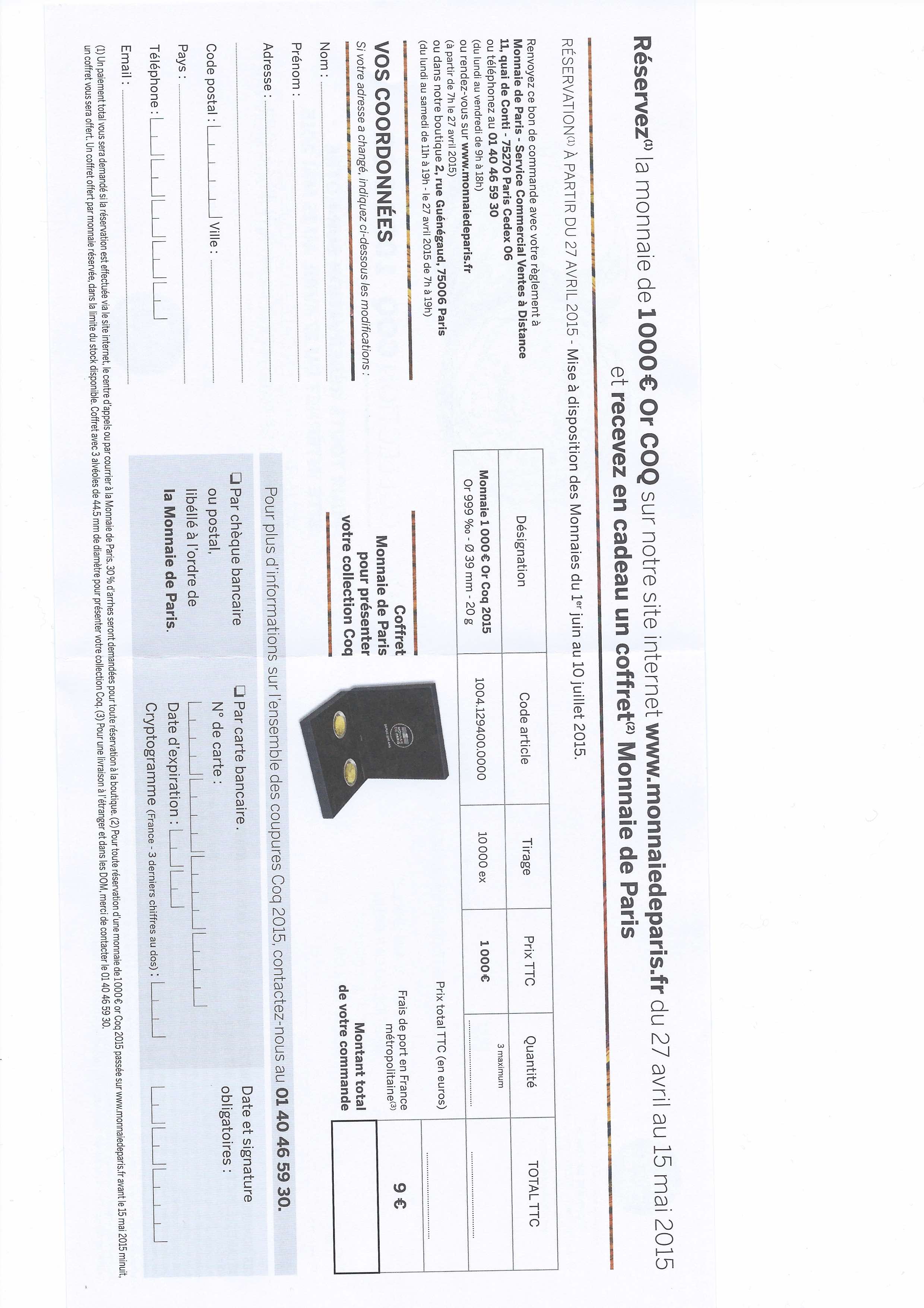 Voilà ce que j'ai reçu aujourd'hui (non je ne l'achèterai pas mais c'est autre chose qui m'intéresse plus particulièrement sur cette offre). Apparement, la MDP va sortir un coffret pour ranger les 3 pièces. Reste à savoir si elle le vendra au détail ou s'il faut acheter la pièce de 1000 voir 5000 s'il y en a une.