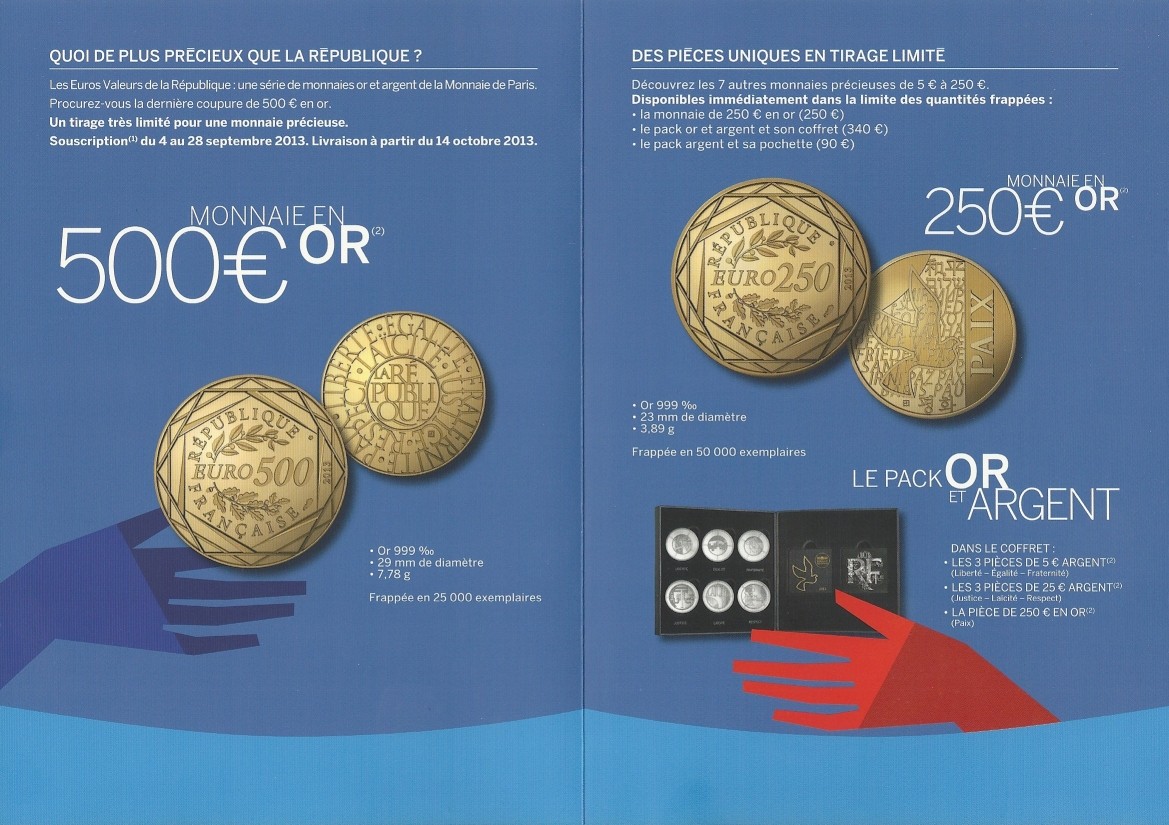 Après les pièces Liberté, Égalité, Fraternité, Justice, Laïcité, Respect et Paix, l’Euro de la République symbolise l’incarnation de toutes ces valeurs réunies. Prestigieuse par sa composition en or pur 999 ‰ et son tirage limité, cette monnaie se présente comme un objet rare, reflet du savoir-faire multiséculaire des ateliers de la Monnaie de Paris installés au cœur de la capitale, qui fêteront en 2014 leur 1150è anniversaire.