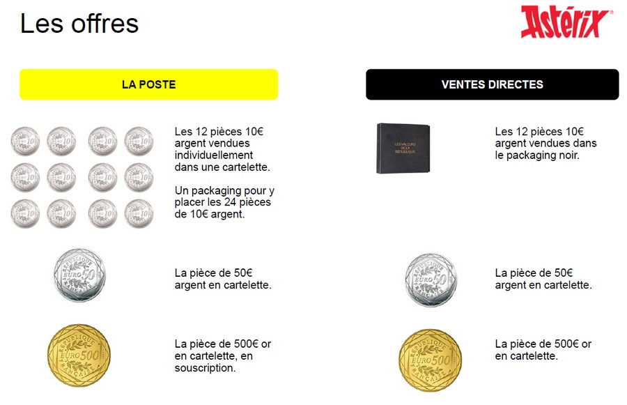 La 50 € argent "paix" ainsi que la 500 € or "respublica"seront présentées sous forme de "cartelette".