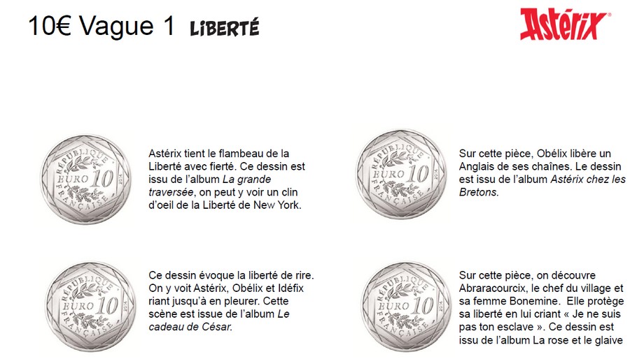La collection est composée de 24 modèles de 10 euros Argent (333 milièmes), mettant en scène un ou plusieurs personnages de la fameuse bande dessinée . Vendue avec une cartelette qui reprend son dessin en couleur, chaque pièce est tirée à 125 000 exemplaires. A cette occasion, La Monnaie de Paris va lancer une importante campagne de communication nationale à destination du grand public.