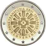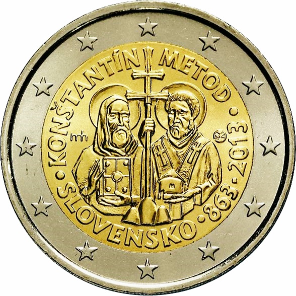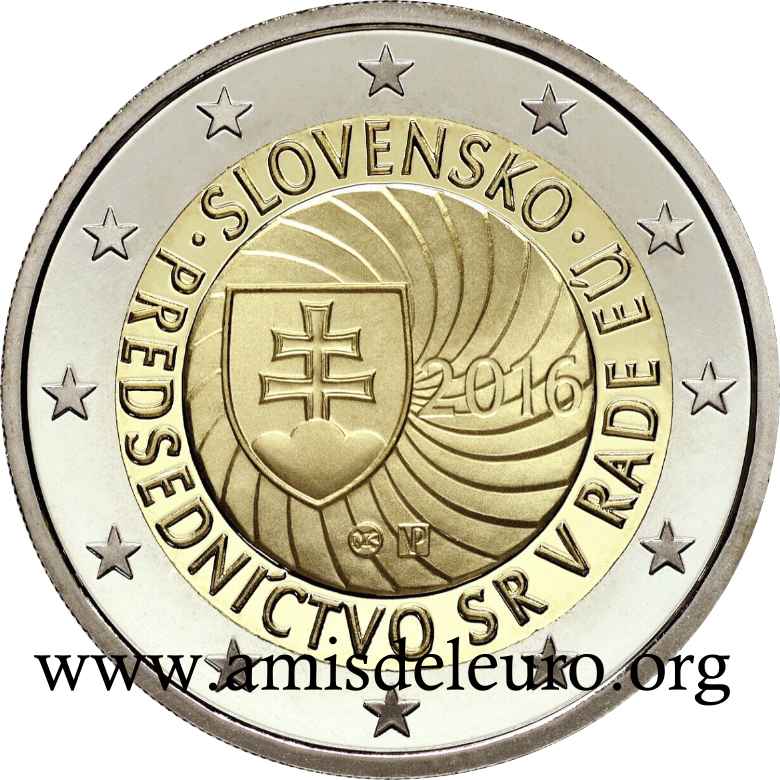 - 1 et 2 EUR : la double croix au milieu des trois collines, croix qui figure sur le drapeau national. La croix est soutenue par les collines pour exprimer la stabilité. L’indication SLOVENSKO est à droite du motif