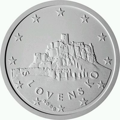 - 10, 20, 50 cent : le château de Bratislava, l’emblème de la double croix et l’indication SLOVENSKO en bas du motif