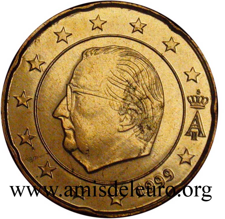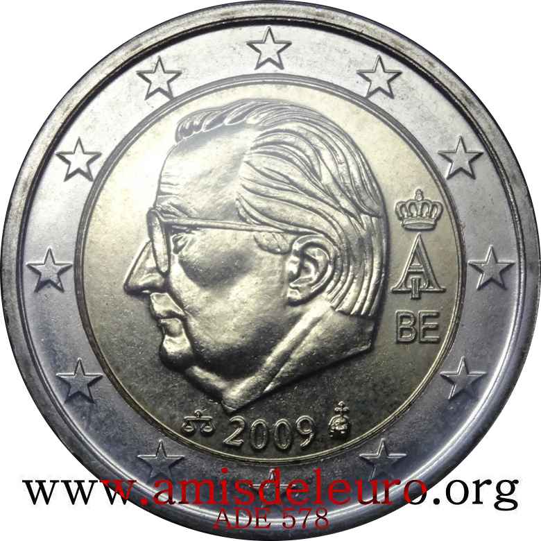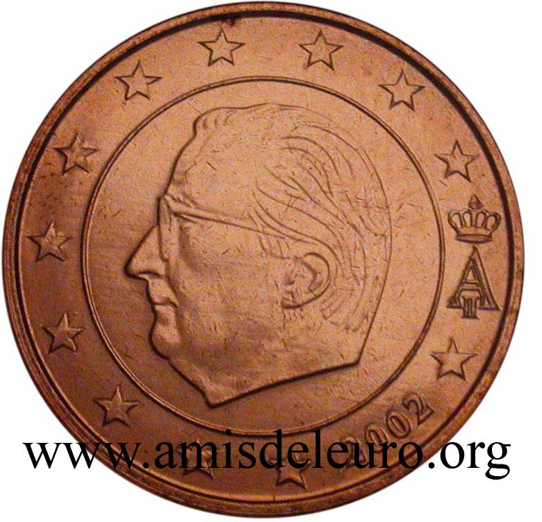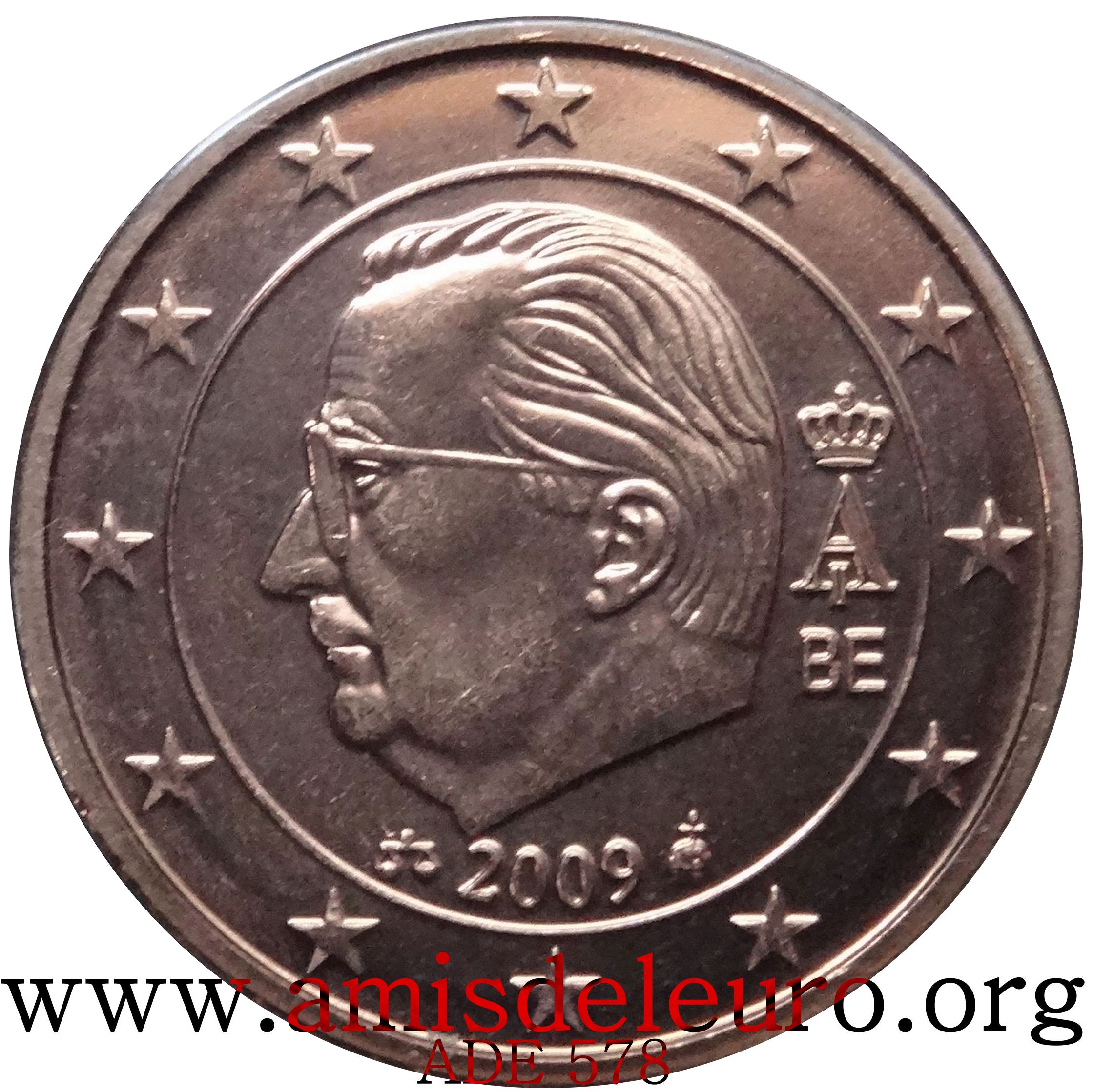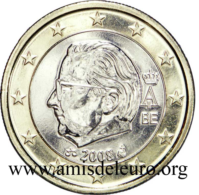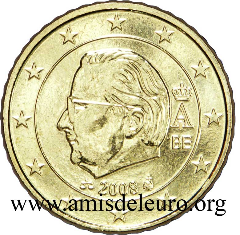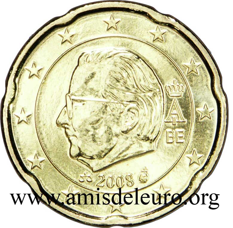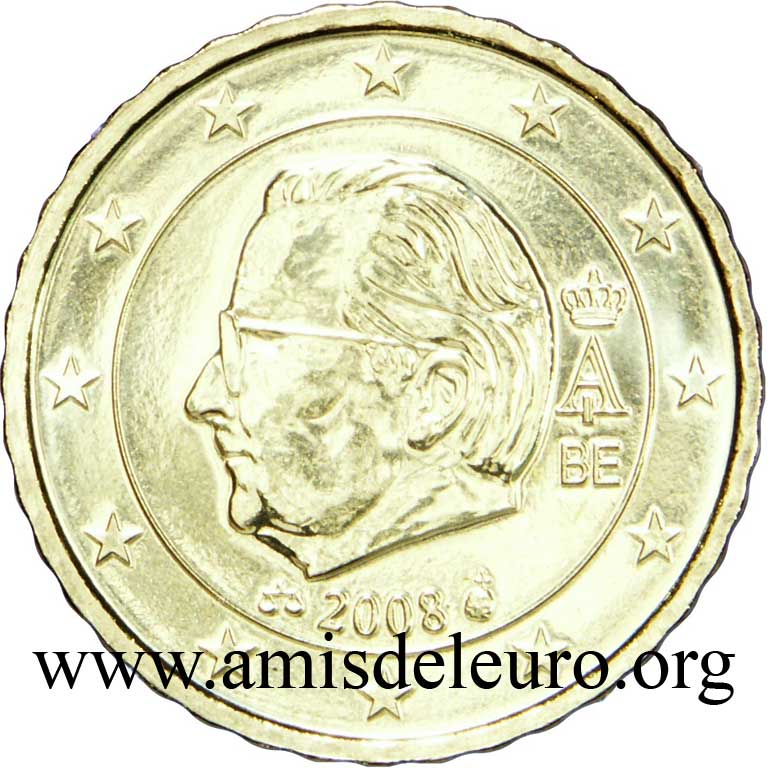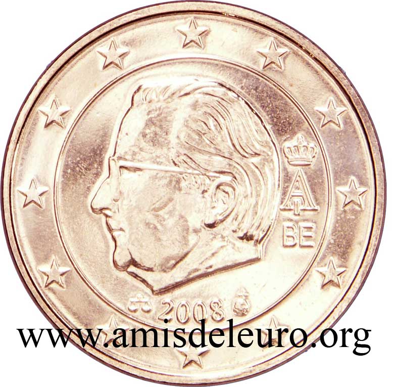 - En 2008, pour que figurent sur les pièces une identification claire du pays (soit libellé complet du pays soit une abréviation de celui-ci) et pour que les 12 étoiles soient disposées de la même façon que sur le drapeau européen. La Monnaie Royale profita de ces changements pour ajouter ses deux poinçons et modifier légèrement le profil du roi Albert II. Désormais, on trouvera sur les séries belges en euros, en plus de ces deux poinçons, les initiales BE. Tous ces ajouts ont été placés ainsi que le millésime et le A couronné à l'intérieur de la partie centrale, les étoiles occupant désormais toute la couronne. Il faut néanmoins noter que les deux poinçons figurent sur les pièces commémoratives depuis quelque temps déjà y compris sur les 2 EUR commémoratives, et ce depuis la première en 2005.