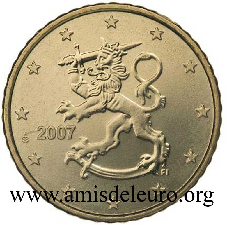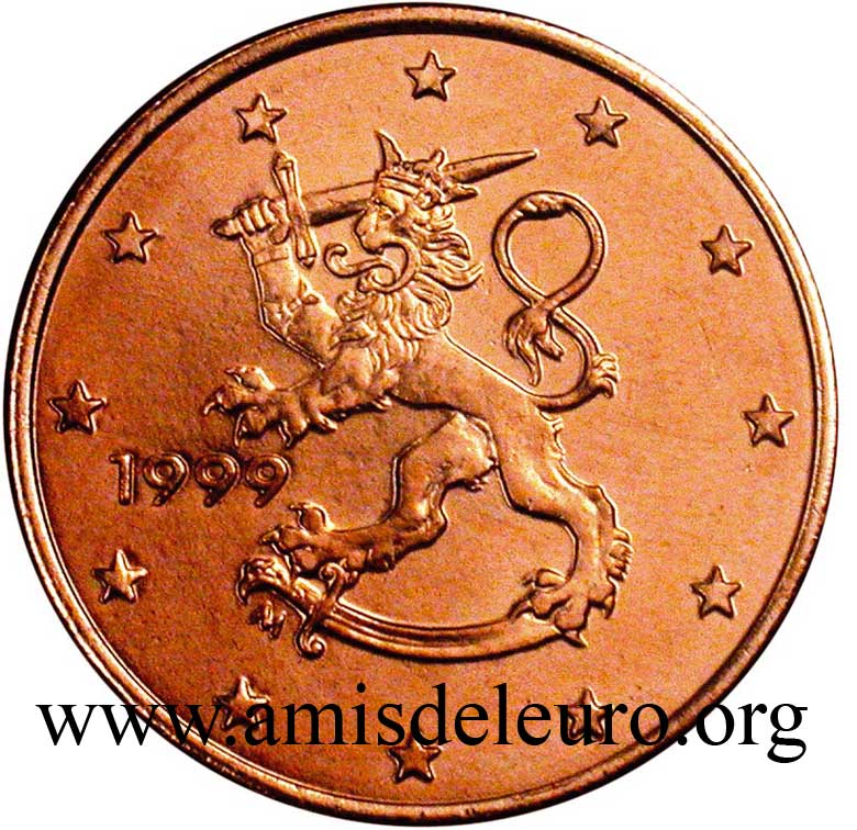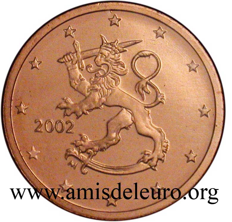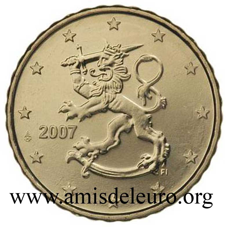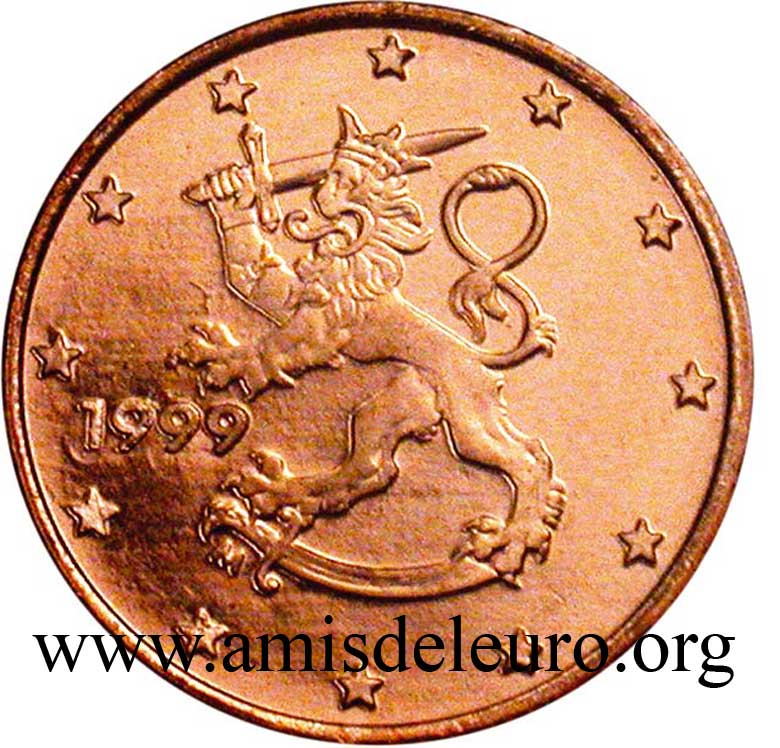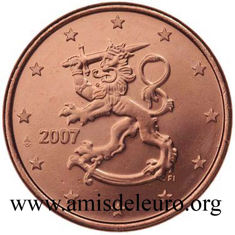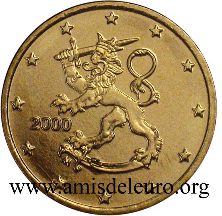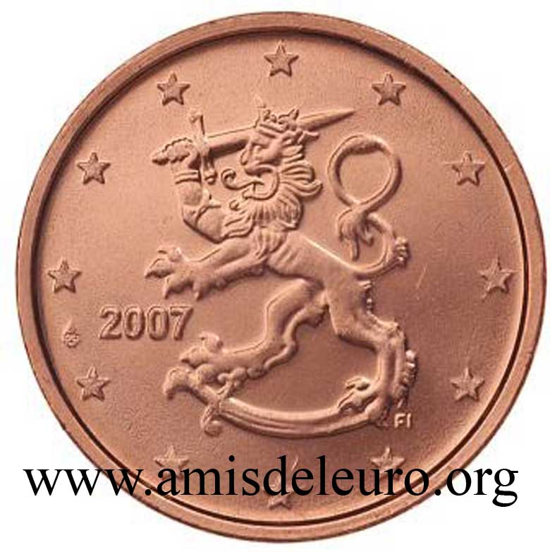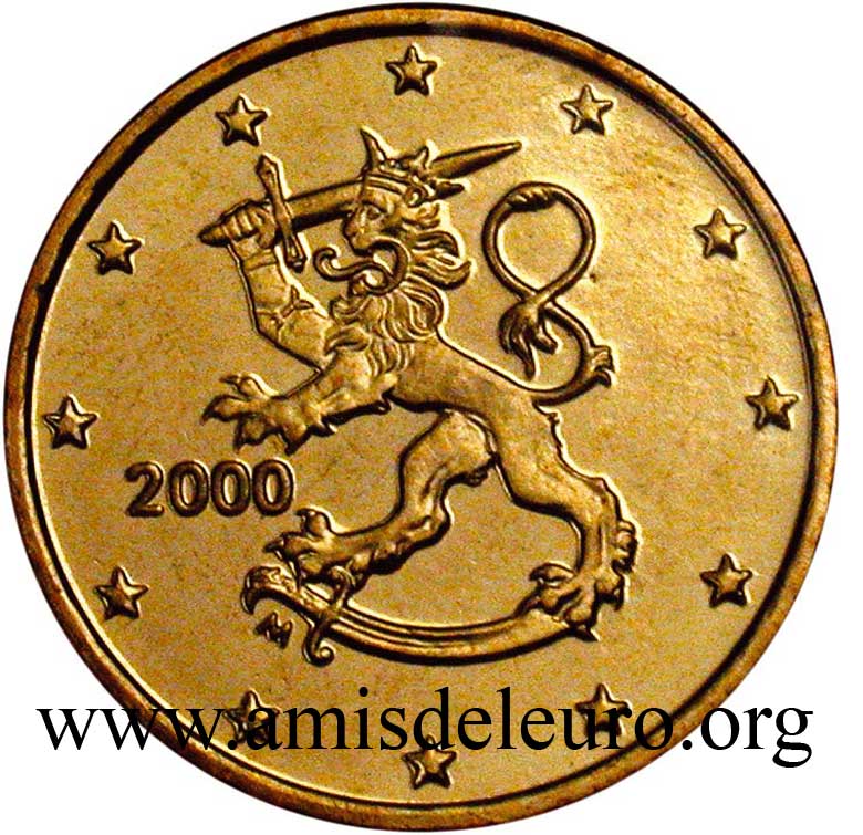 - 1 à 50 cent : le lion héraldique qui illustre la fierté de l’indépendance enfin conquise. Le lion couronné sur un sabre est très ancien et remonte aux nombreuses guerres que les Finlandais durent mener : le sabre sur lequel le lion finlandais marche est un sabre russe... A compter du millésime 2007, la Finlande a modifié ses faces nationales afin de respecter les recommendations figurant dans le Journal Officiel de la commission Européenne n°2005/491/CE qui stipule que l'on doit trouver sur les pièces une identification claire du pays (soit libellé complet du pays soit ses initiales). La Finlande a donc choisi d'ajouter les initiales FI, et au passage le poinçon de la Rahapaja Oy (). Elle a également profité pour passer à la nouvelle face commune qui n'était obligatoire qu'à partir de 2008. Bizarrement, l'initiale M du maitre Raimo Makkonen, sous la poignée du sabre a disparu. Petite anecdote, le poinçon de la Rahapaja Oy En 2011 le poinçon de la Rahapaja Oy Les 2 euro commémoratives La Finlande a émis au moins une pièce commémorative de 2 EUR chaque année depuis 2004, dont la plupart sont très belles. En décembre 2019, le ministère des Finances a conclu un contrat avec Oy Nordic Moneta Ab pour la production et la vente de pièces commémoratives finlandaises et pour la vente de séries de pièces finlandaises et de pièces spéciales de deux euros. Le marché a été attribué sur la base d'un appel d'offres. Le contrat entre le ministère des Finances et Oy Nordic Moneta Ab se déroule du 20 décembre 2019 au 31 décembre 2022. Le contrat comprend une option d'extension pour 2023 et 2024. La Finlande émet deux coffrets BU chaque année, dont un avec la commémorative. De plus, une production significative de non circulantes est émise.