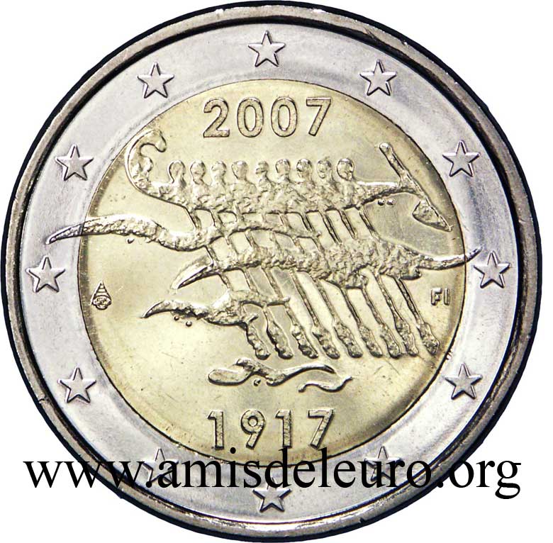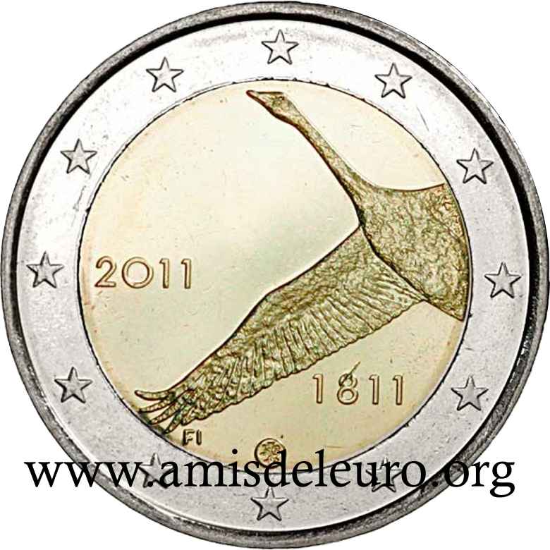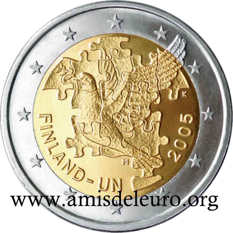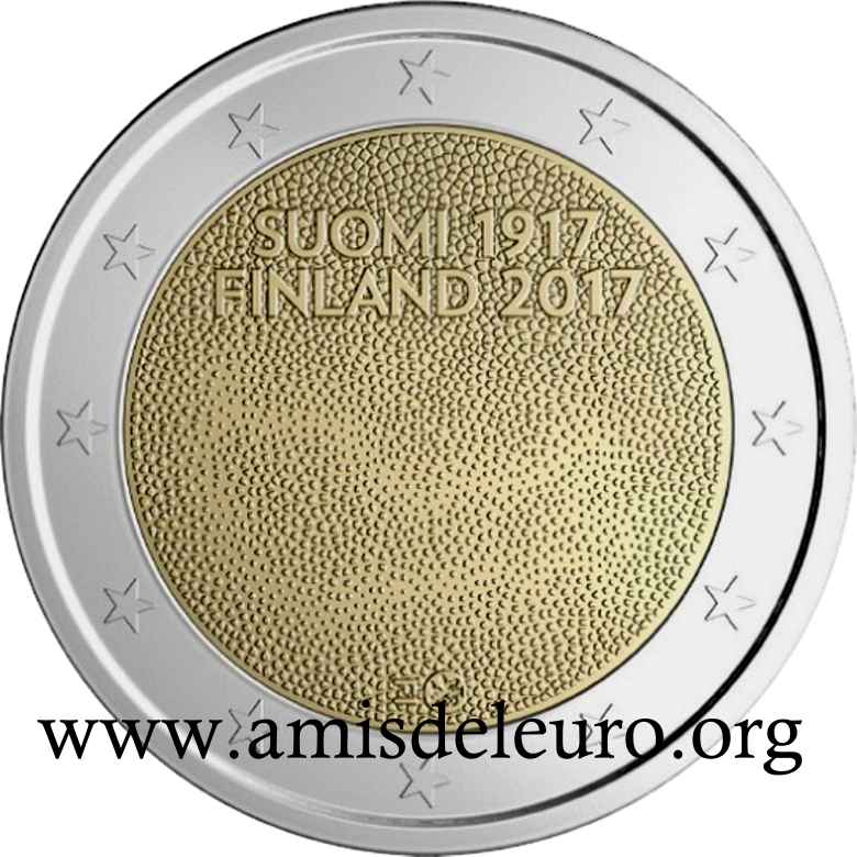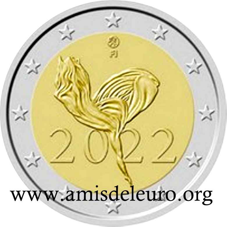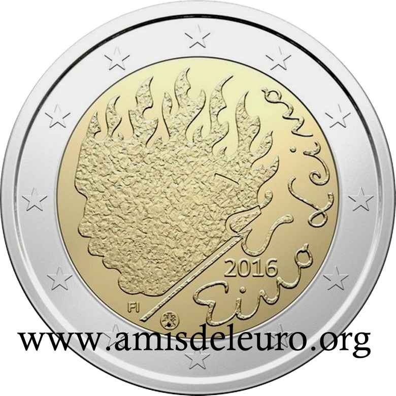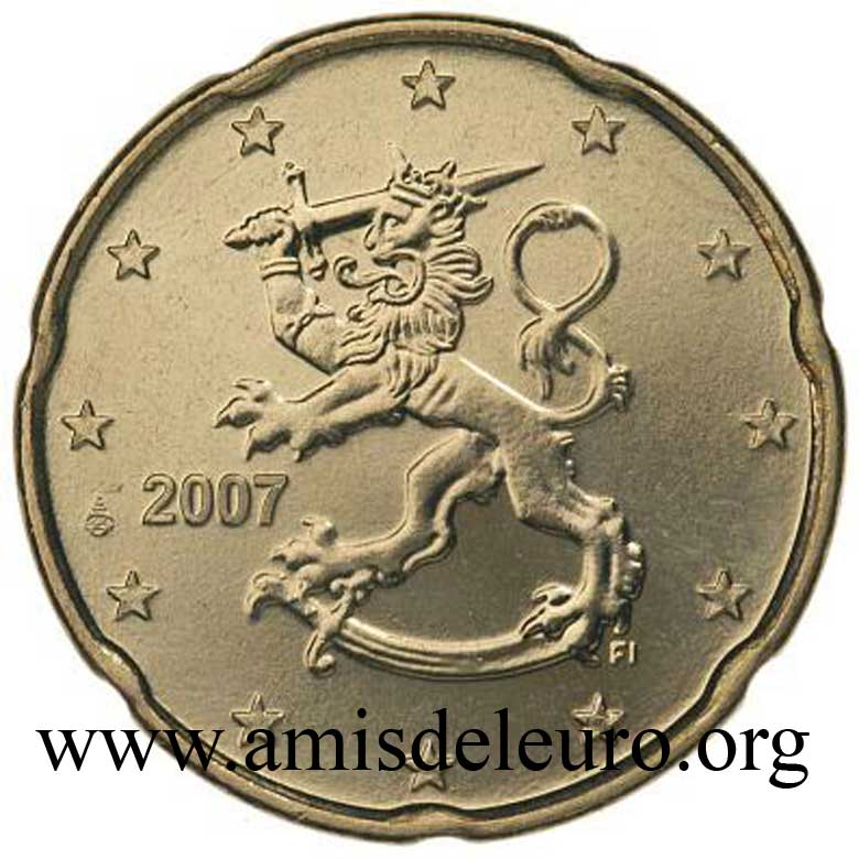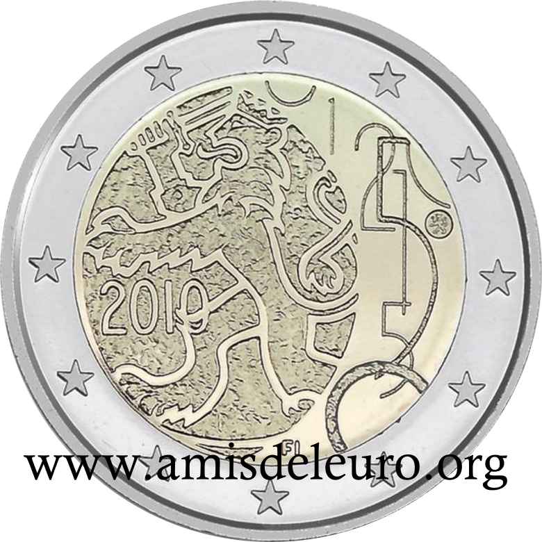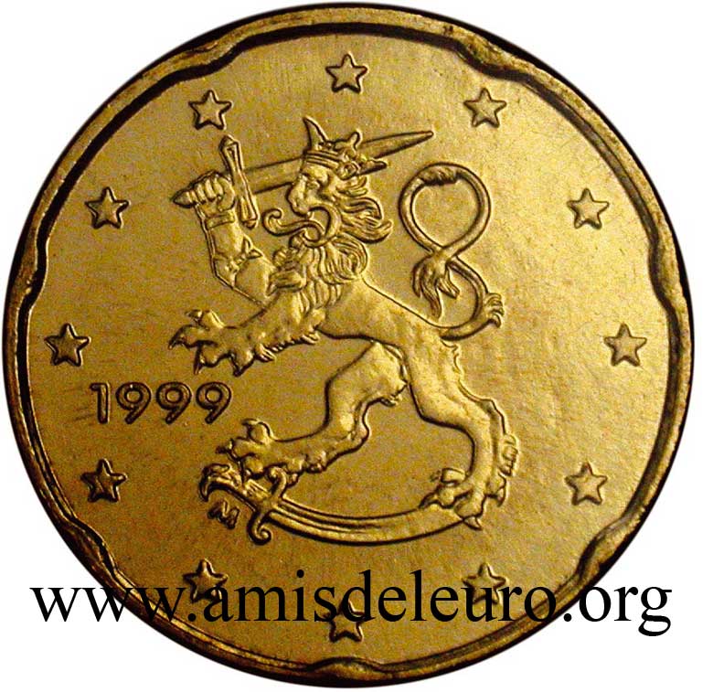 - 1 à 50 cent : le lion héraldique qui illustre la fierté de l’indépendance enfin conquise. Le lion couronné sur un sabre est très ancien et remonte aux nombreuses guerres que les Finlandais durent mener : le sabre sur lequel le lion finlandais marche est un sabre russe... A compter du millésime 2007, la Finlande a modifié ses faces nationales afin de respecter les recommendations figurant dans le Journal Officiel de la commission Européenne n°2005/491/CE qui stipule que l'on doit trouver sur les pièces une identification claire du pays (soit libellé complet du pays soit ses initiales). La Finlande a donc choisi d'ajouter les initiales FI, et au passage le poinçon de la Rahapaja Oy (). Elle a également profité pour passer à la nouvelle face commune qui n'était obligatoire qu'à partir de 2008. Bizarrement, l'initiale M du maitre Raimo Makkonen, sous la poignée du sabre a disparu. Petite anecdote, le poinçon de la Rahapaja Oy En 2011 le poinçon de la Rahapaja Oy Les 2 euro commémoratives La Finlande a émis au moins une pièce commémorative de 2 EUR chaque année depuis 2004, dont la plupart sont très belles. En décembre 2019, le ministère des Finances a conclu un contrat avec Oy Nordic Moneta Ab pour la production et la vente de pièces commémoratives finlandaises et pour la vente de séries de pièces finlandaises et de pièces spéciales de deux euros. Le marché a été attribué sur la base d'un appel d'offres. Le contrat entre le ministère des Finances et Oy Nordic Moneta Ab se déroule du 20 décembre 2019 au 31 décembre 2022. Le contrat comprend une option d'extension pour 2023 et 2024. La Finlande émet deux coffrets BU chaque année, dont un avec la commémorative. De plus, une production significative de non circulantes est émise.
