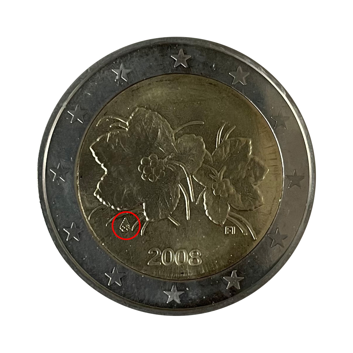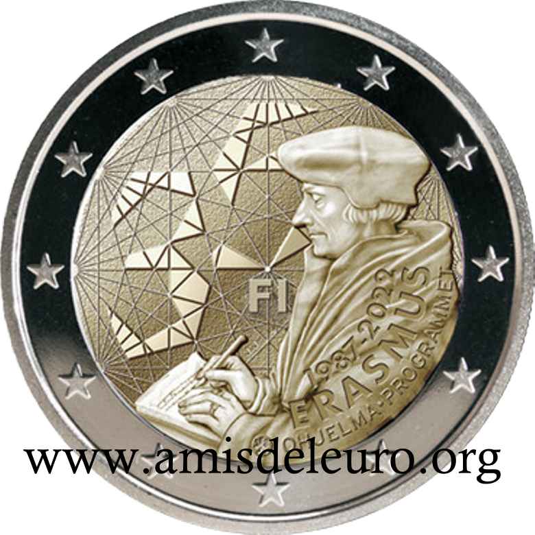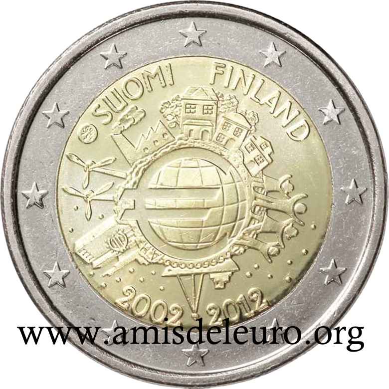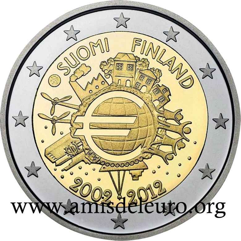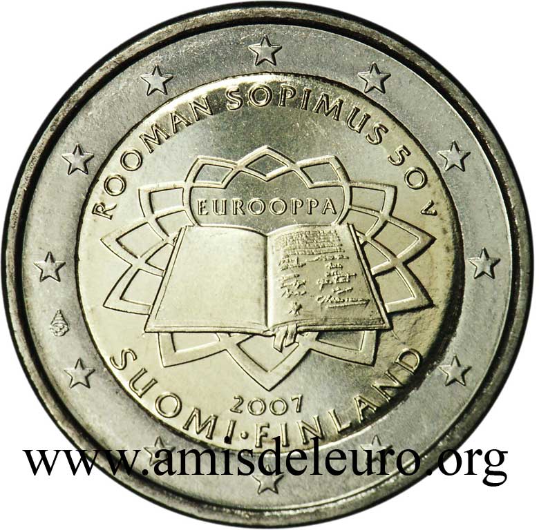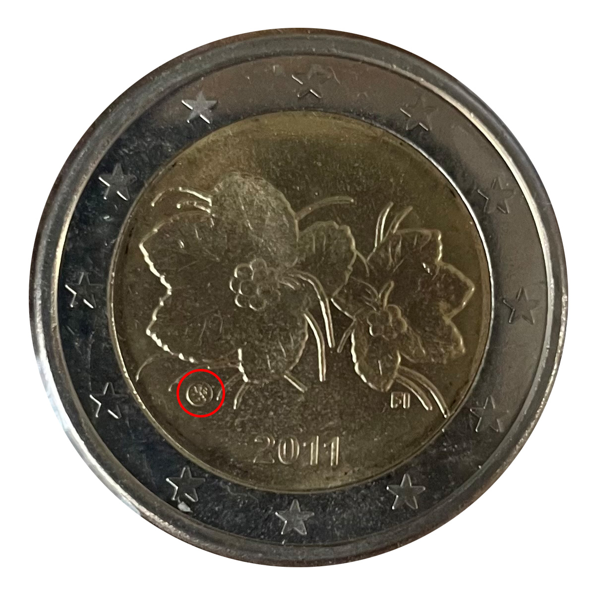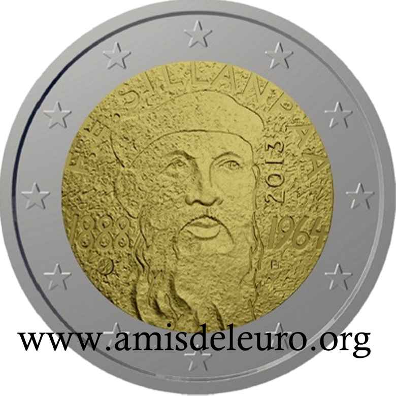 - 1 à 50 cent : le lion héraldique qui illustre la fierté de l’indépendance enfin conquise. Le lion couronné sur un sabre est très ancien et remonte aux nombreuses guerres que les Finlandais durent mener : le sabre sur lequel le lion finlandais marche est un sabre russe... A compter du millésime 2007, la Finlande a modifié ses faces nationales afin de respecter les recommendations figurant dans le Journal Officiel de la commission Européenne n°2005/491/CE qui stipule que l'on doit trouver sur les pièces une identification claire du pays (soit libellé complet du pays soit ses initiales). La Finlande a donc choisi d'ajouter les initiales FI, et au passage le poinçon de la Rahapaja Oy (). Elle a également profité pour passer à la nouvelle face commune qui n'était obligatoire qu'à partir de 2008. Bizarrement, l'initiale M du maitre Raimo Makkonen, sous la poignée du sabre a disparu. Petite anecdote, le poinçon de la Rahapaja Oy En 2011 le poinçon de la Rahapaja Oy Les 2 euro commémoratives La Finlande a émis au moins une pièce commémorative de 2 EUR chaque année depuis 2004, dont la plupart sont très belles. En décembre 2019, le ministère des Finances a conclu un contrat avec Oy Nordic Moneta Ab pour la production et la vente de pièces commémoratives finlandaises et pour la vente de séries de pièces finlandaises et de pièces spéciales de deux euros. Le marché a été attribué sur la base d'un appel d'offres. Le contrat entre le ministère des Finances et Oy Nordic Moneta Ab se déroule du 20 décembre 2019 au 31 décembre 2022. Le contrat comprend une option d'extension pour 2023 et 2024. La Finlande émet deux coffrets BU chaque année, dont un avec la commémorative. De plus, une production significative de non circulantes est émise.