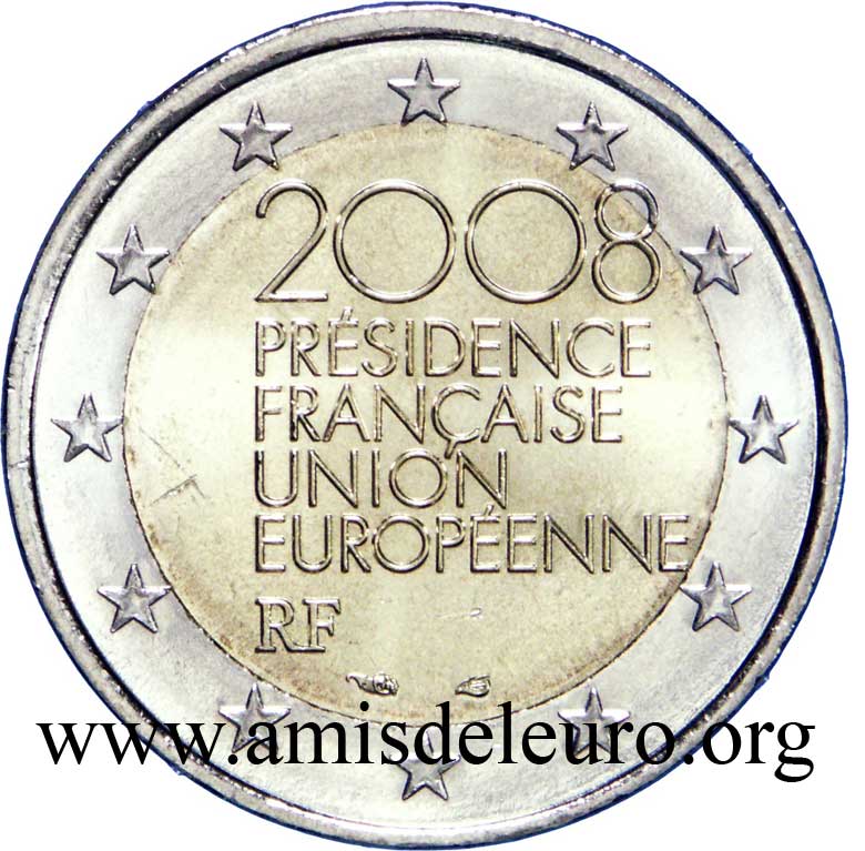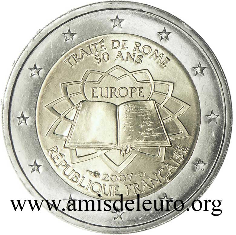 Les 2 euro commémoratives La France a attendu 2007 ou plutôt contrainte, comme les 12 autres pays, d'émettre sa première pièce commémorative, à l'occasion du cinquantième anniversaire de la signature du Traité de Rome ! Et encore, la parution en a été très longtemps différée (pour cause d’élections…), après toutes les autres. Les premières « Traité de Rome » françaises que les collectionneurs ont obtenues venaient de l’étranger ! La seconde pièce commémorative est cette fois-ci émise par la Monnaie de Paris, de son propre chef. Au départ, le thème devait être celui du 50e anniversaire de la Ve République mais courant avril, nous apprendrons que ce thème est abandonné au profit de celui de « Présidence de la Commission européenne ». Cette pièce a été beaucoup critiquée par sa simplicité déconcertante, d'autant plus que celle-ci a été réalisée par le designer Philippe Starck : la mention « 2008 Présidence française de l’Union européenne » entourée des 12 étoiles. Vous pouvez d'ailleurs consulter les échanges avec M. Starck à ce sujet ici. La Monnaie de Paris émettra dès lors au moins une commémorative par année.