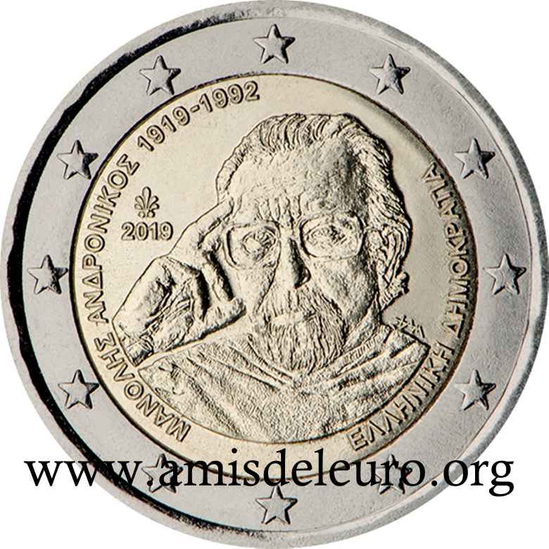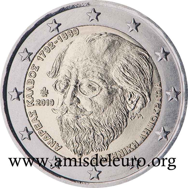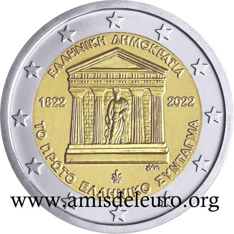 Le nom du pays n'apparaît pas sur les monnaies euro grecques circulantes sauf sur la tranche des 2 euro. La grèce, comme l'Autriche a repris la valeur faciale de la pièce sur la face nationale alors que cela est proscrit par les recommandations de l'article 2 du Journal Officiel de la commission Européenne n°2009/23/CE, mais la Grèce a bénéficié d'une dérogation au vue de son alphabet atypique. Les pièces grecques sont toutes différentes : Les petites pièces évoquent la vocation maritime de la Grèce. - 1 cent : la trirème antiqueLes pièces jaunes ont sans doute moins de sens immédiat hors de Grèce, car elles concernent directement l’histoire de l’indépendance retrouvée dans les années 1830 : - 10 cent : Constantin Rhigas Vélestinlis (1757-98), grande figure de la renaissance grecque, mort en martyrEnfin, les bimétalliques:
