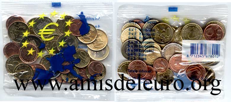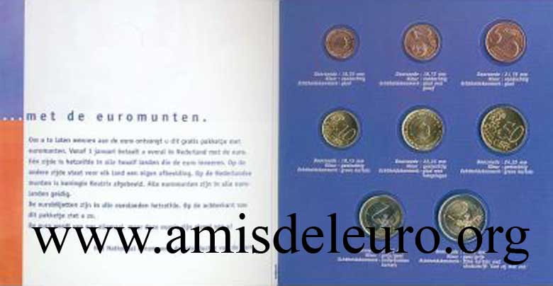 | Numéro d'€uro : K/19 Quantité : 16 000 000 Présentation : Plaquette | | Prix d'émission : 0 € | Cotation en état neuf : 12 € Cotation second choix : 9 € | | Contenu | 1 cent | 2 cent | 5 cent | 10 cent | 20 cent | 50 cent | 1 euro | 2 euro | 1 | 1 | 1 | 1 | 1 | 1 | 1 | 1 | | Années : Variées : de 1999 à 2001 | | Commentaires : Ce coffret a été donné à tous les habitants des Pays-Bas âgés de plus de 6 ans. |