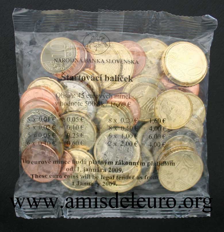 | Numéro d'€uro : K/25 Quantité : 1 200 000 Présentation : Sachet | | Prix d'émission : 16,6 € | Cotation en état neuf : 32 € Cotation second choix : 28 € | | Contenu | 1 cent | 2 cent | 5 cent | 10 cent | 20 cent | 50 cent | 1 euro | 2 euro | 5 | 5 | 5 | 6 | 8 | 8 | 6 | 2 | | Années : Toutes les pièces sont de 2009. | | Commentaires : 16,6 € correspondent à 500,06 couronnes slovaques. |