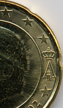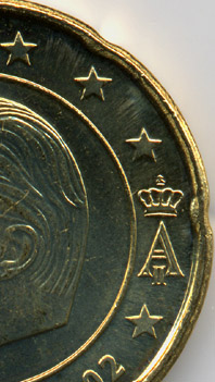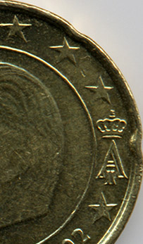 Les 3 variétés | Aux deux premières variétés connues de longue date sous la dénomination "à petites ou à grandes étoiles", vient s’ajouter une troisième "à très grandes étoiles". Nous ne disposons pas d’assez de recul pour donner des proportions définitives, mais aucune des trois variétés n’est rare et, en première approximation : la variété 1 "à petites étoiles" représente environ 75 % la variété 2 "à grandes étoiles" représente environ 15 % la variété 3 "à très grandes étoiles" représente environ 10 %. André Duquet, ADE 311: "Toutes les 20 cent 2000 sont à grandes étoiles, toutes les 20 cent postérieures à 2002 sont à petites étoiles. De nouveau, sur base des sets FDC et coffrets BE en ma possession, on peut résumer la situation comme suit : - les 20 cent à grandes étoiles (asymétriques) se retrouvent dans les sets FDC 1999, 2000 et 2001, - les 20 cent à petites étoiles (symétriques) se retrouvent dans les sets FDC 2002 et postérieurs, ainsi que dans tous les coffrets BE, y compris 1999, 2000 et 2001." |