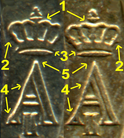 Les 2 avers | €.070600/4 : Avers 1 : 1) Le socle de la croix, au-dessus de la couronne, est jointif avec celle-ci. 2) Les piliers de la couronne sont fins et réguliers (sans ornementation). 3) La base de la couronne se prolonge de part et d’autre du coussin qui la supporte. 4) La bordure gauche du A présente deux convexités (au pied et au 2/3 de sa hauteur). 5) La pointe du A est arrondie. | €.070600/5 : Avers 2 : 1) Le socle de la croix, au-dessus de la couronne, est séparé de celle-ci. 2) Les piliers de la couronne sont épais et irréguliers (présence d’ornementations). 3) La base de la couronne s’arrête au niveau au-dessus du coussin qui la supporte. 4) La bordure gauche du A est régulière, légèrement concave. 5) La pointe du A est pointue. |