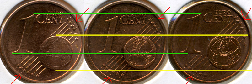 Comment les distinguer ? La distinction des variétés 1 et 2 est très facile (la différence de taille du globe est évidente). La distinction des variétés 1 et 3 est moins aisée (la forme différente des extrémités des traits du bas est nette). Ted Hoogendoorn précise que la gravure du globe est plus nette et fine pour les variétés 2 et 3 que pour la variété 1 où elle est assez grossière. Dans la mesure où la qualité de frappe ou l’usure peuvent modifier l’aspect d’une pièce dans ce sens, ce critère ne peut être retenu comme déterminant. |