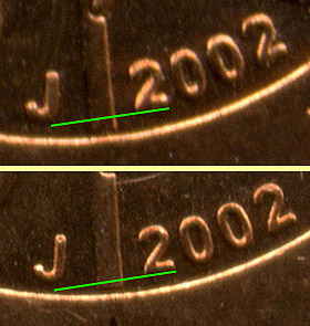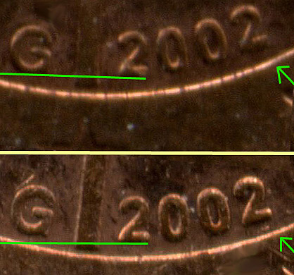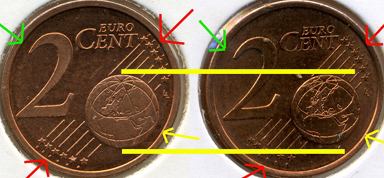 | Allemagne : 2 cent 2002 Les 2 revers | | Revers 1 Ateliers A, D, F, G et J Gravure normale - Le globe et le 2 sont de taille normale : le bord du globe et la tête du 2 sont proches du listel - Les traits sont épais et leurs extrémités proches du listel. | Revers 2 Ateliers A, D et J Petite gravure - Le globe et le 2 sont de petite taille : le bord du globe et la tête du 2 sont éloignés du listel - Les traits sont fins et leurs extrémités éloignées du listel. |