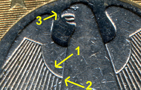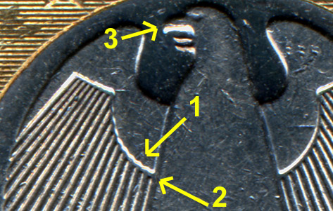 Allemagne : 1 euro 2002 Les 2 avers  |  | Avers 1 Ateliers A, D, F, G et J 1) À gauche, le bord de l’aile est lisse 2) Les traits (plumes) sont proches du bord 3) Le bec est épais | Avers 2 Atelier G 1) A gauche, le bord de l’aile est festonné 2) Les traits (plumes) sont éloignés du bord 3) Le bec est mince | Les 2 revers | | Revers 1 Ateliers A, D, F, G et J - La signature LL, les lettres d’EURO, les traits et leurs extrémités sont fins - Les étoiles sont très petites | Revers 2 Ateliers D, F et G - La signature LL, les lettres d’EURO, les traits et leurs extrémités sont épais - Les étoiles sont petites | Les 10 variétés connues | | Revers 1 | Revers 2 | Avers 1 | Variété 1 A, D, F, G et J | Variété 2 D, F et G | Avers 2 | Variété 3 G | Variété 4 G | Les 2 variétés de l'atelier D Combinés à l’avers A1, les deux revers R1 ou R2 définissent les deux variétés 1 et 2. Les deux variétés sont courantes (proportions estimées à 45 % pour la variété 1 et à 55 % pour la variété 2). A1 et R1 : €.071500/2 A1 et R2 : €.071500/3 Les 2 variétés de l'atelier F Combinés à l’avers A1, les deux revers R1 ou R2 définissent les deux variétés 1 et 2. Les deux variétés sont courantes (proportions estimées à 75 % pour la variété 1 et à 25 % pour la variété 2). A1 et R1 : €.071500/4 A1 et R2 : €.071500/5 Les 4 variétés de l'atelier G Les combinaisons des deux avers A1 ou A2 aux deux revers R1 ou R2 définissent les 4 variétés : variété 1 : avers 1 + revers 1 (environ 62 %) - €.071500/6 variété 2 : avers 1 + revers 2 (environ 3 %) - €.071500/7 variété 3 : avers 2 + revers 1 (environ 5 %) - €.071500/8 variété 4 : avers 2 + revers 2 (environ 30 %) - €.071500/9 Le nombre de pièces examinées est trop faible pour obtenir des statistiques fiables, mais les variétés 1 et 4 sont courantes et les variétés 2 et 3 sont moins fréquentes. Ateliers A et J : Pas de variété Les pièces examinées des ateliers A et J présentent toutes l’unique combinaison avers A1 + revers R1. | D'autres variétés ? | L’étude de ces variétés a été réalisée par Philippe Gibone (AD€ 051) et Jean-Luc Cirodde (AD€ 041) sur la base de l’observation de quelques centaines de pièces de la circulation courante. Il est possible que d’autres variétés (combinaisons avers / revers) existent mais n’aient pas été observées. | Comment les distinguer ? La distinction n’est pas difficile. Les avers La bordure festonnée de l’aile est très facilement repérable (notamment en faisant varier l’angle d’incidence de la lumière sur la pièce). Les revers La différence entre les deux revers est plus particulièrement marquée sur la signature. | Si vous effectuez à votre tour des statistiques, ou si vous découvrez d'autres €variétés allemandes ou d'autres pays, contactez varietes@amisdeleuro.org pour une éventuelle publication sur ce site.