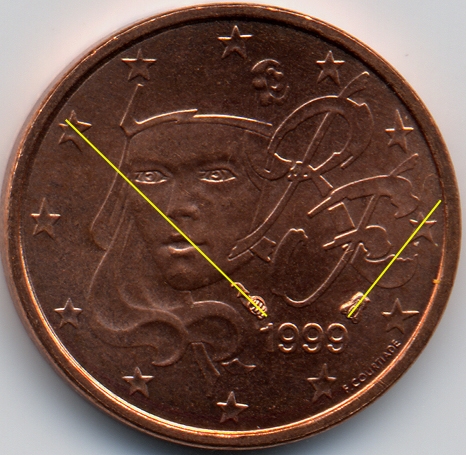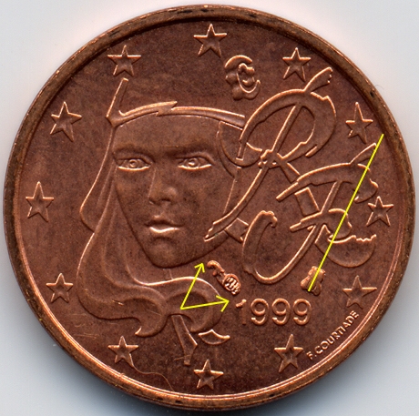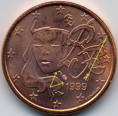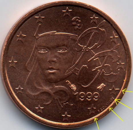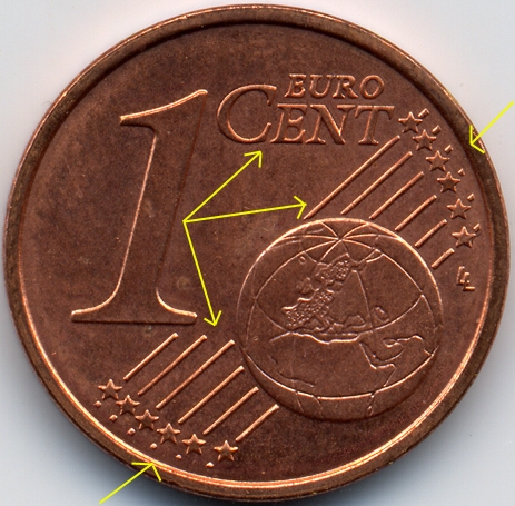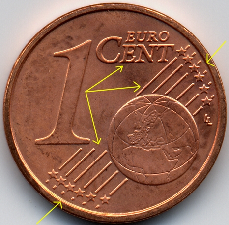 Les 8 variétés connues Pointages de l'AD€ 041 | Revers + Avers + Emplacement | Frappe courante : fréquence sur 6 193 pièces observées | Frappe BU | €.014100/1 : Type 1 A | R 1 + Av 1 + A | 22 % | | €.014100/2 : Type 1 B | R 1 + Av 1 + B | 0,7 % | | €.014100/3 : Type 2 A | R 2 + Av 1 + A | 12 % | | €.014100/4 : Type 2 B | R 2 + Av 1 + B | 21 % | | €.014100/5 : Type 3 C | R 1 + Av 2 + C | 0,2 % | | €.014100/6 : Type 3 D | R 1 + Av 2 + D | 0,3 % | | €.014100/7 : Type 4 C | R 2 + Av 2 + C | 17 % | | €.014100/8 : Type 4 D | R 2 + Av 2 + D | 27 % | Oui |