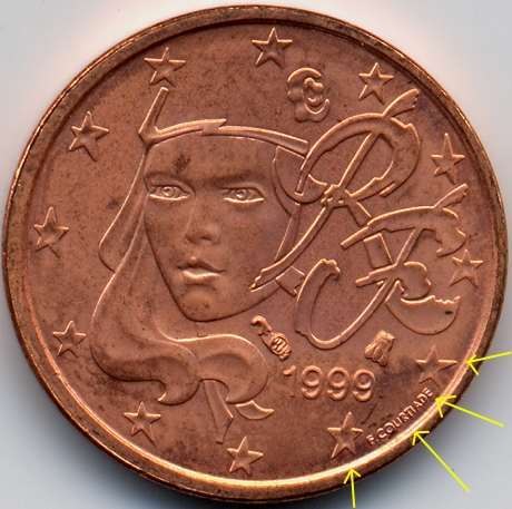 Les 2 avers  |  | Avers 1 (avers des types 1 et 2) : - étoiles proches du listel - signature éloignée du listel - E de Courtiade proche de l'étoile | Avers 2 (avers des types 3 et 4) : - étoiles éloignées du listel - signature proche du listel - E de Courtiade éloignée de l'étoile |