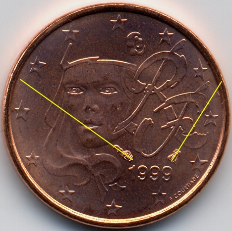 Les 2 revers | | Revers 1 (revers des types 1 et 3) : - extrémités des traits longues - traits et caractères légèrement plus "épais" | Revers 2 (revers des types 2 et 4) : - extrémités des traits courtes (réduites à des points, en bas) - traits et caractères légèrement plus "fins" | Les 4 positions des différents  |  | Position A (types 1 et 2) : - l'axe de l'abeille est orientée vers 2h 1/4 - la corne, orientée vers 10h, est haute (plus proche du bord de la joue que du 1 de la date et éloignée de la boucle de cheveu) | Position B (type 1 et 2) : - l'axe de l'abeille est orientée vers 2h 1/4 - la corne, orientée vers 10h, est basse (à égale distance du bord de la joue et du 1 de la date et proche de la boucle de cheveu) | Remarques : les descriptions de N&C indiquent une abeille orientée vers 2h pour A et vers 2h 1/4 pour B. D'après les observations de Jean-Luc CIRODDE, si l'abeille B est très légèrement plus inclinée que la A, la différence est minime (et d'autant plus difficile à repérer que l'abeille est "empâtée", ce qui est fréquemment le cas de la B). Par contre, les différences de position de la corne sont très nettes. |  |  | Position C (type 3 et 4) : - l'axe de l'abeille est orientée vers 3h - la corne, orientée vers 10h, est basse | Position D (type 3 et 4) : - l'axe de l'abeille est orientée vers 2h 1/2 - la corne, orientée vers 9h 1/2, est plus haute |