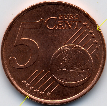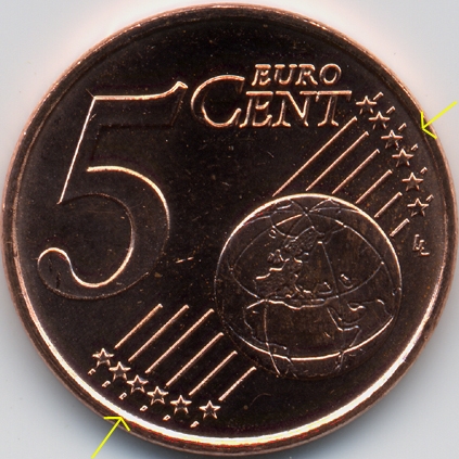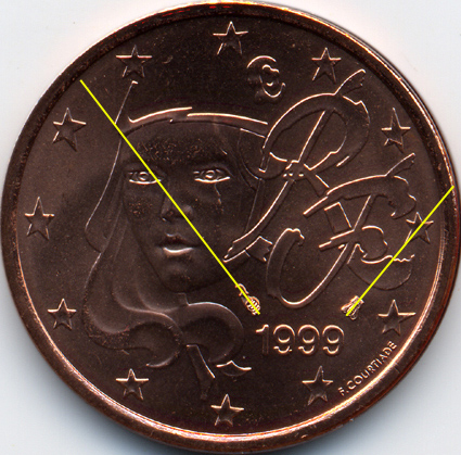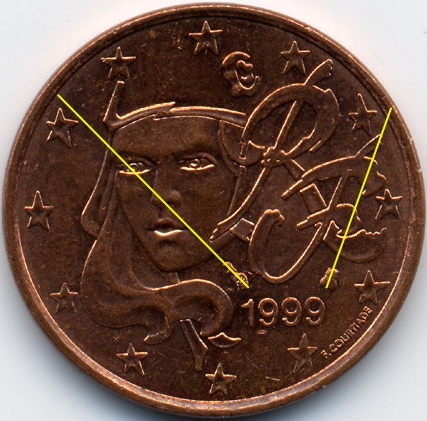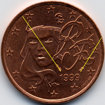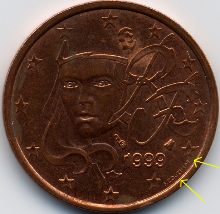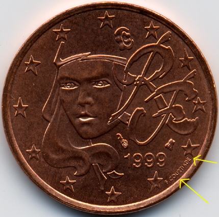 | France : 5 cent 1999 Les 2 avers  |  | Avers 1 (avers des types 1 A, 1 B et 2) : - la signature est éloignée du listel - le "E" de COURTIADE est proche de l'étoile | Avers 2 (avers du type 3) : - la signature est proche du listel - le "E" de COURTIADE est éloigné de l'étoile |