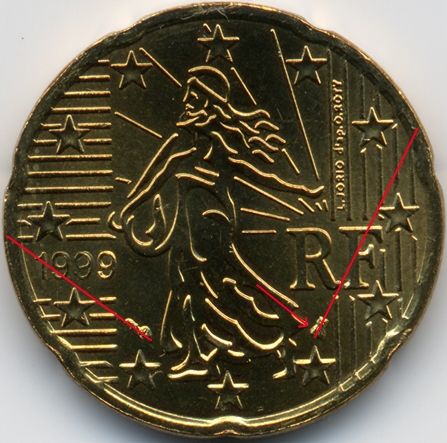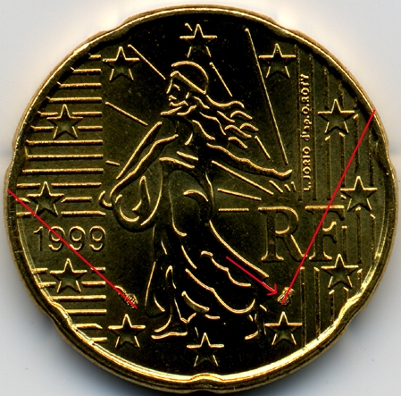 France : 20 cent 1999 Les 2 positions des différents  |  | Position A : - l'abeille est basse (pointe de la robe vers le milieu du corps) et son l'axe est orienté vers 2h 1/2. - la corne est orientée vers 8h 3/4 environ | Position B : - l'abeille est haute (pointe de la robe vers le bas du corps) et son axe est orienté vers 2h 1/2 - 2h 3/4. - la corne est orientée vers 8h 1/2 environ | Les 2 variétés connues | Pointages de l'AD€ 041 | Frappe courante : fréquence sur 1.047 pièces observées | Frappe BU | | €.054100/1 : Position A | 93 % | | | €.054100/2 : Position B | 7 % | Oui | Si vous effectuez à votre tour des statistiques, ou si vous découvrez d'autres €variétés allemandes ou d'autres pays, contactez varietes@amisdeleuro.org pour une éventuelle publication sur ce site.