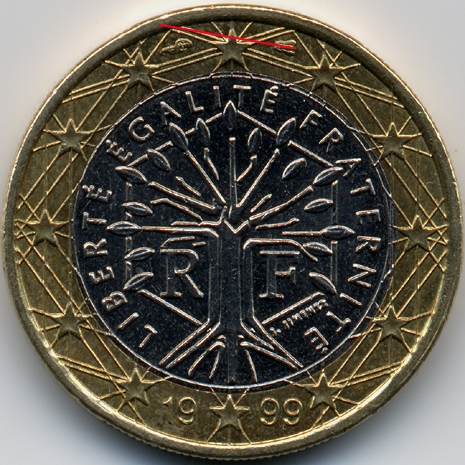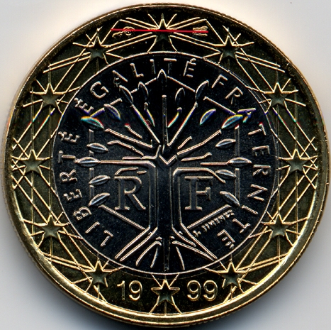 | France : 1 euro 1999 Les 2 positions de différents | | Position A : - l'axe de l'abeille est horizontal, parallèle aux côtés supérieurs des deux branches latérales de l'étoile. | Position B : - l'axe de l'abeille est oblique, dirigé vers le haut de l'étoile. |