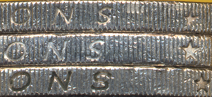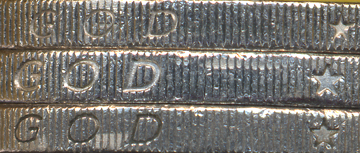- type 2 : D de GOD peu incliné (€.097000/3 et 4) - type 3 : D de GOD incliné (€.097000/5 et 6) - type 4 : D de GOD peu incliné (€.097000/7 et 8) |  | | De haut en bas : - type 2 : caractères et étoiles de taille moyenne (€.097000/3 et 4) - type 3 : caractères et étoiles de grande taille + S de ONS étroit (€.097000/5 et 6) - type 4 : caractères et étoiles de grande taille + S de ONS large (€.097000/7 et 8) | N.B. : le type 1 (caractères et étoiles de petite taille) est celui de la 2 euro 1999. Comme toujours, dans le cas de caractères de taille plus ou moins grande, la qualité de frappe peut rendre la distinction délicate. L'inclinaison plus ou moins accentuée du D n'est pas évidente. A priori, aucune des variétés n'est très rare. Si vous effectuez à votre tour des statistiques, ou si vous découvrez d'autres €variétés allemandes ou d'autres pays, contactez varietes@amisdeleuro.org pour une éventuelle publication sur ce site.