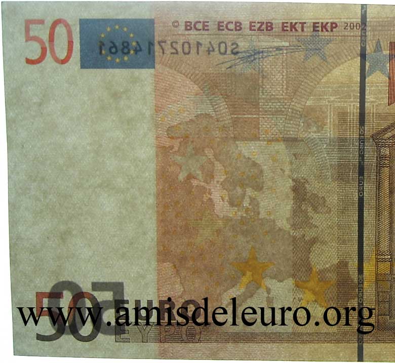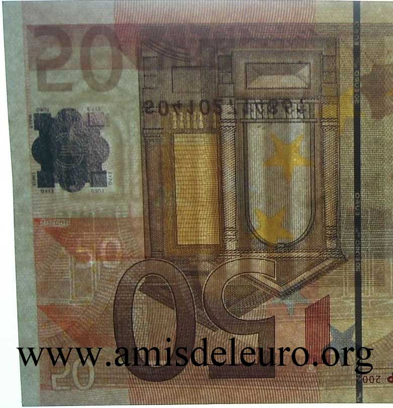 Impression avec filigrane opposé Ce billet signalé par Francesco Spinelli a été tout d’abord considéré comme un faux, du fait de l’absence apparente du filigrane et du code-barres situés normalement à gauche sur l’avers. Pourtant, les codes long et court signalés (respectivement S04102714861 et J002G2) sont corrects. Aussi, quelle ne fut pas ma surprise, à réception du billet, de découvrir que le filigrane était bel et bien présent, mais à droite du billet et inversé ! L’examen était d’autant plus délicat que le patch holographique recouvre presque totalement le filigrane-portail. Nous ne connaissons que cet unique exemplaire, pour l’instant. Rareté : RRRR