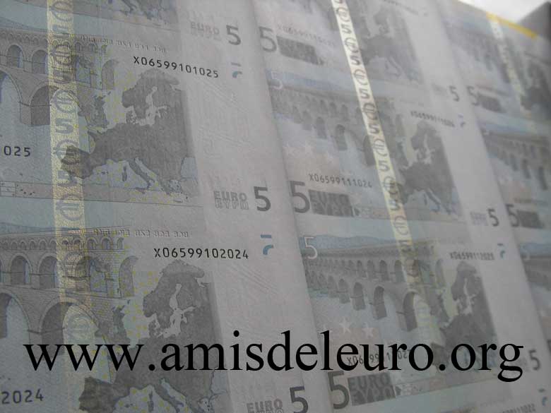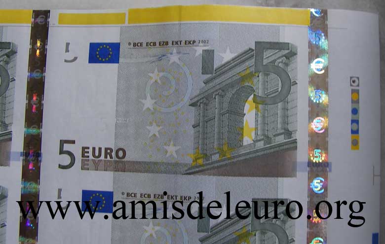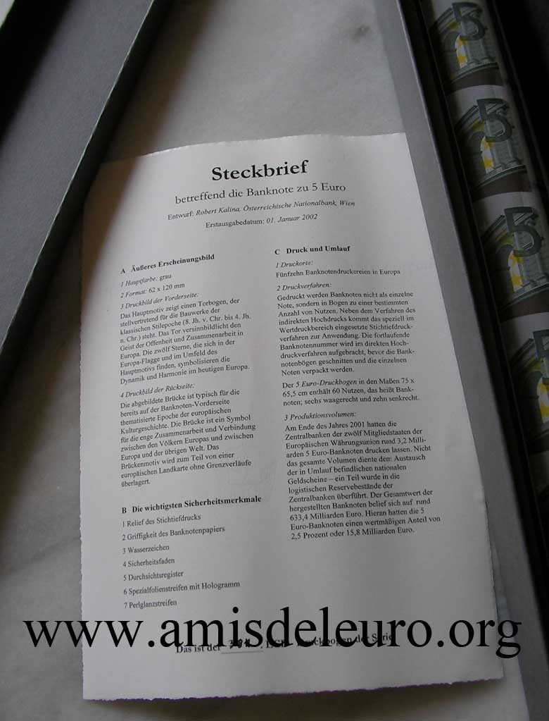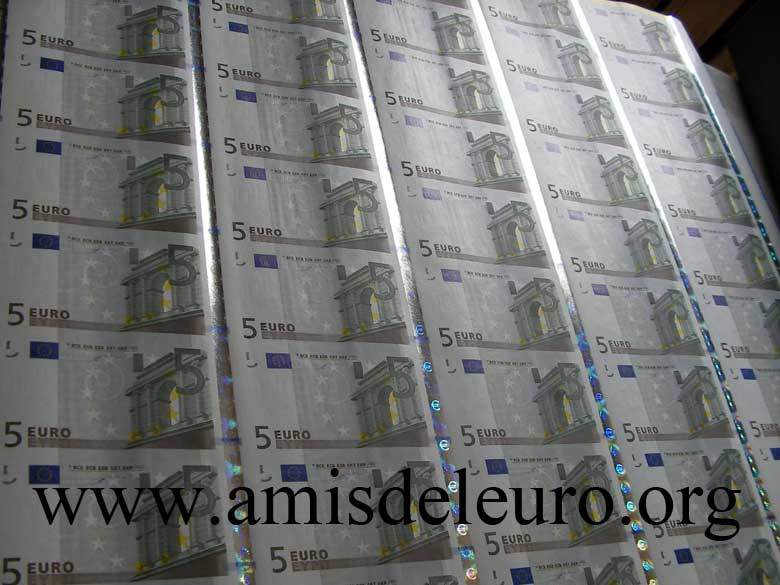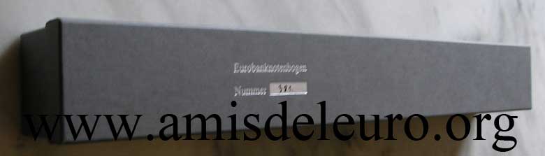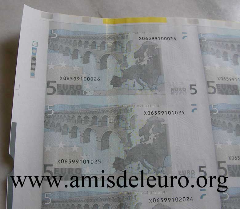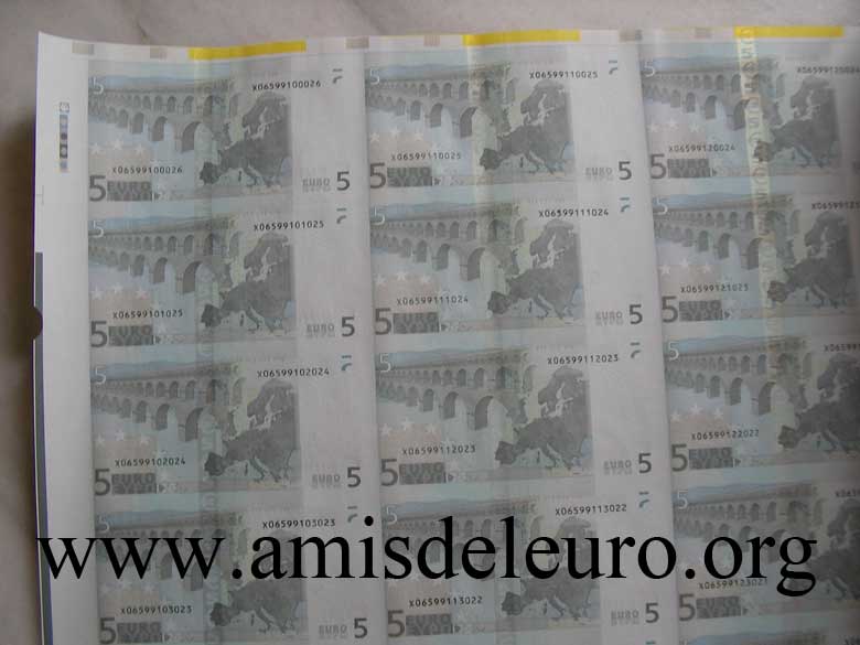 La Bundesbank (banque centrale nationale allemande) à vendu près de 4000 planches de billets de 5, 10 et 20€ de la combinaison pays/imprimeur X/P > Les planches de 5€ contiennent 60 billets (6 colonnes* 10 rangées, 74cm*66cm) et se vendaient près de 550 euros. > Les planches de 10€ contiennent 54 billets (6 colonnes* 9 rangées, 75cm*60cm) et se vendaient près de 900euros. > Les planches de 20€ contiennent 45 billets (5 colonnes* 9 rangées, 68cm*65cm) et se vendaient près de 1500euros. Le tout dans un beau coffret avec bien sûr un certificat* ! L'Autriche a également mis en circulation des feuilles de la combinaison pays/imprimeur N/F * : le certificat et le coffret n'ont pas été fournit pour toutes les planches vendues!! Apparement, seules les premiers vendues en avaient, par la suite les autres ont été vendus dans des rouleaux cartonnés... Attention aux fautés artificiels : certaines personnes découpent de façon décalée les billets pour faire croire à une erreur de massicotage! | |