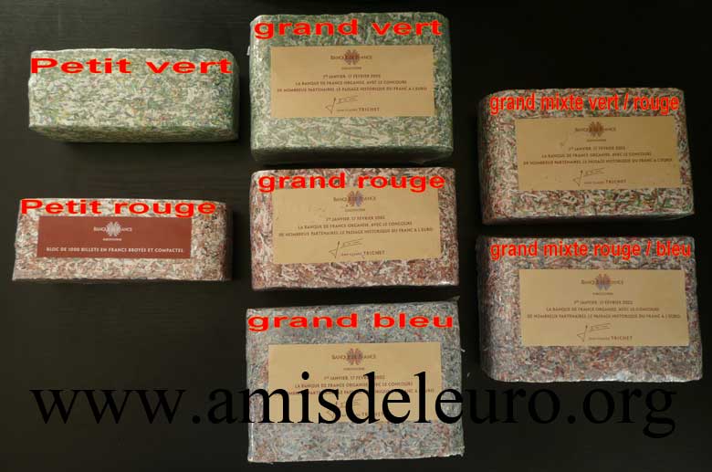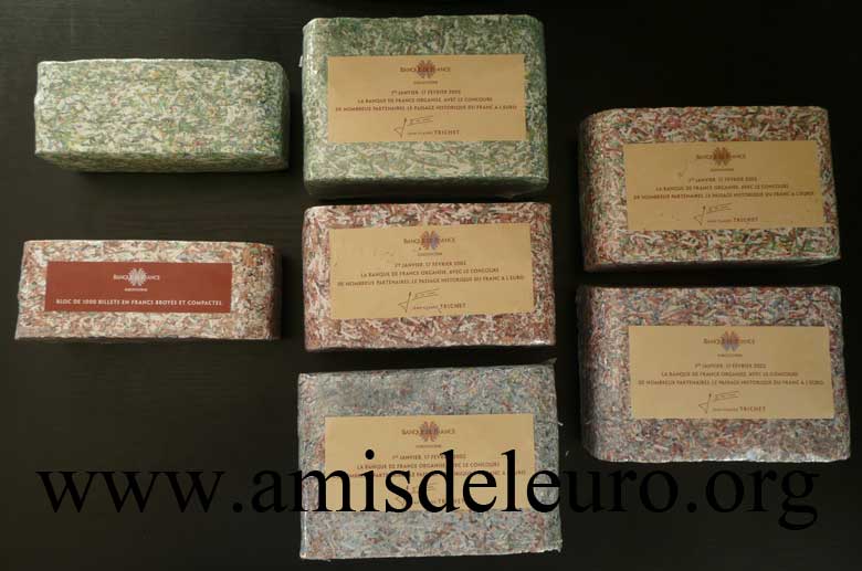 Il existe des briques d'anciens billets de francs : au passage à l'euro les billets français ont été récupérés, puis détruits... mais il en reste des traces... Voyez ces bloc de billets broyés, puis compactés avec une étiquette avec la signature de Jean-Claude Trichet (alors gouverneur de la Banque de France en 2002). Il existe des briques d'anciens billets en francs. Au passage à l'euro, les billets français ont été récupérés, puis détruits... mais il en reste des traces... Voyez ces blocs de billets broyés, puis compactés avec une étiquette portant la signature de Jean-Claude Trichet (alors gouverneur de la Banque de France en 2002). Pour quelle raison ? Simplement pour les offrir aux partenaires ayant participéà la mise en place de l'euro et aux cadres travaillant à la BdF), en présentant une part de nostalgie sous une forme assez originale ! Ces blocs n'étaient pas en vente au public. Il existe plusieurs types de blocs : (les quantités fabriquées restent inconnues mais sont certainement très limitées, quelques milliers au plus) Certains étaient destinés au personnel de base, d'autres aux cadres ... mais les informations récoltés étant parfois contradictoires il est impossible de faire le point à ce jour.