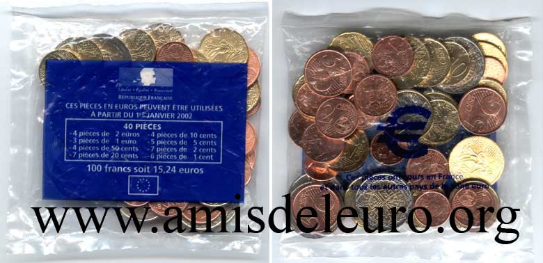 | Prix d'émission : 15,24 € | Cotation en état neuf : 30 € Cotation second choix : 24 € | | Contenu | 1 cent | 2 cent | 5 cent | 10 cent | 20 cent | 50 cent | 1 euro | 2 euro | 6 | 7 | 5 | 4 | 7 | 4 | 3 | 4 | | Années : Variées : de 1999 à 2001. Quelques monnaies de 2002 (des 2 euro en particulier) ont été signalées en kit. | | Commentaires : 15,24 € correspondent à 100 francs français. Le contenu du kit s'élève à 15,25 €, ce qui signifie qu'un "cadeau" de 1 cent a été fait à chaque acheteur ! |