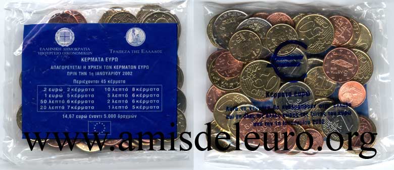 | Numéro d'€uro : K/12 Quantité : 3 000 000 Présentation : Sachet | | Prix d'émission : 14,67 € | Cotation en état neuf : 38 € Cotation second choix : 34 € | | Contenu | 1 cent | 2 cent | 5 cent | 10 cent | 20 cent | 50 cent | 1 euro | 2 euro | 5 | 6 | 6 | 8 | 7 | 6 | 5 | 2 | | Années : Toutes les pièces sont de 2002, avec lettre d'atelier étranger : lettre "F" pour les 1, 2, 5, 10 et 50 cent ; lettre E pour la 20 cent ; lettres S pour les 1 et 2 euro. | | Commentaires : 14,67 € correspondent à 5 000 drachmes. |