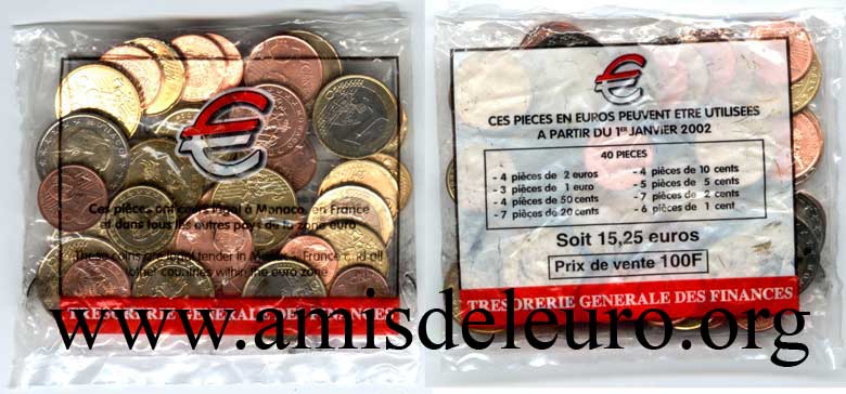 | Numéro d'€uro : K/17 Quantité : 51 200 Présentation : Sachet | | Prix d'émission : 15,24 € | Cotation en état neuf : 880 € Cotation second choix : 850 € | | Contenu | 1 cent | 2 cent | 5 cent | 10 cent | 20 cent | 50 cent | 1 euro | 2 euro | 6 | 7 | 5 | 4 | 7 | 4 | 3 | 4 | | Années : Toutes les pièces sont de 2001. | | Commentaires : 15,24 € correspondent à 100 francs français. Le contenu du kit s'élève à 15,25 €, ce qui signifie qu'un "cadeau" de 1 cent a été fait à chaque acheteur ! |