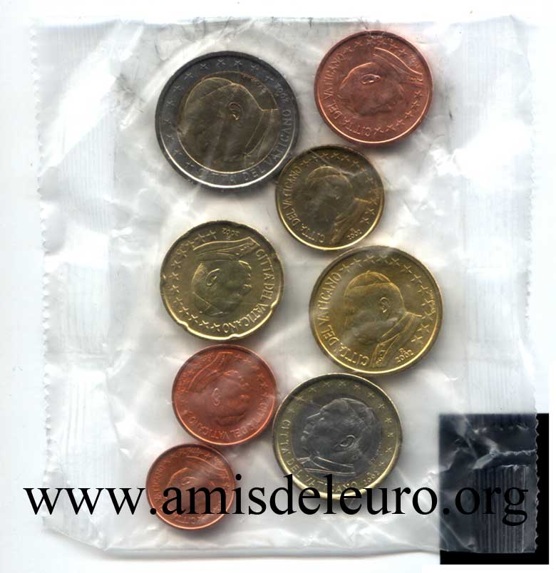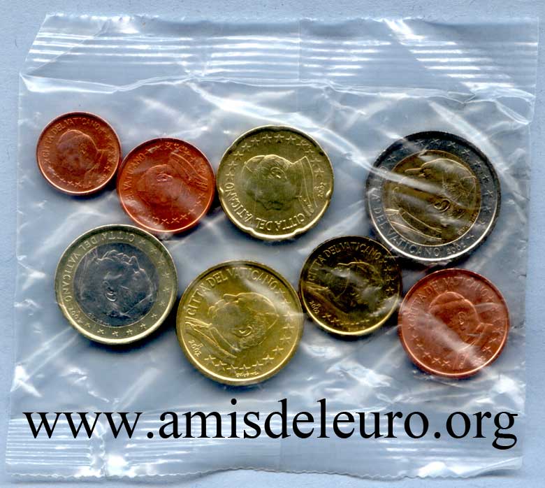 | Numéro d'€uro : K/26 Quantité : 2 000 Présentation : Sachet | | Prix d'émission : 0 € | Cotation en état neuf : 850 € Cotation second choix : 700 € | | Contenu | 1 cent | 2 cent | 5 cent | 10 cent | 20 cent | 50 cent | 1 euro | 2 euro | 1 | 1 | 1 | 1 | 1 | 1 | 1 | 1 | | Années : Toutes les pièces sont de 2002. | | Commentaires : Ces kits ont été donnés aux résidents de la cité du Vatican. Il convient de bien faire attention à l'ouverture tout à fait caractéristique de ce kit (sur fond noir sur la photo ci-dessous) afin de ne pas prendre un faux kit pour un vrai. |