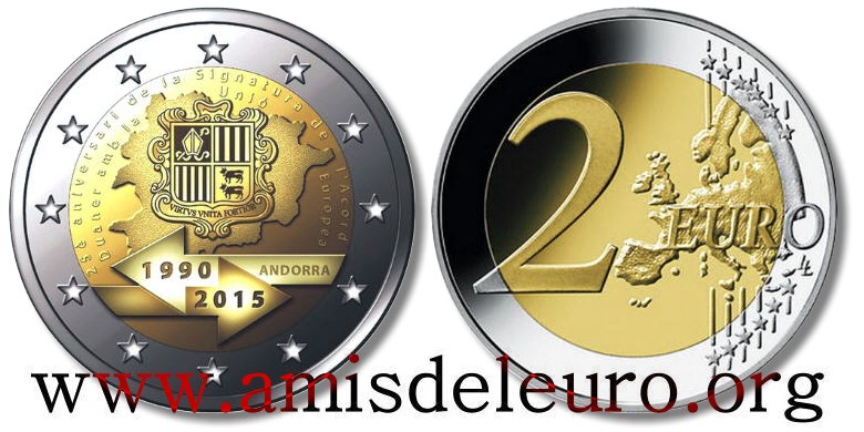 Descriptif avers : Dans la partie supérieure du dessin apparaissent la carte de l’Andorre en arrière-plan et les armoiries de la Principauté en premier plan. Dans la partie inférieure du dessin apparaissent deux flèches opposées qui s’entrecroisent, symbolisant l’accord douanier entre l’Andorre et l’UE et portant l’inscription des dates commémorées, soit «1990» et «2015» (cette dernière étant également l’année d’émission de la pièce) ainsi que le nom du pays émetteur, «ANDORRA». La carte de l’Andorre est entourée de l’inscription «25è aniversari de la Signatura de l’Acord Duaner amb la Unió Europea» (25e anniversaire de la signature de l’accord douanier avec l’Union européenne).