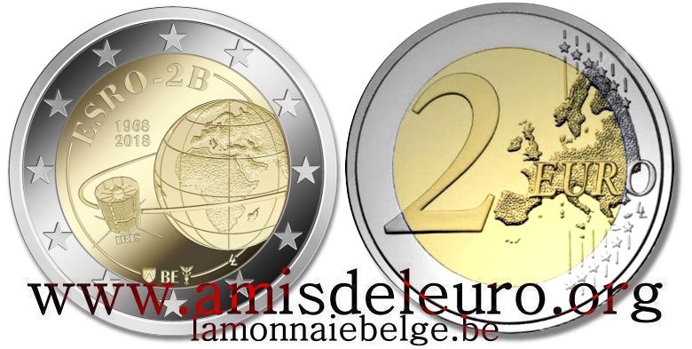 Descriptif avers : le dessin représente le satellite ESRO 2B en orbite autour de la planète Terre. ESRO 2B est le premier satellite de l’Organisation européenne de recherches spatiales ayant été lancé avec succès en mai 1968. Renommé «IRIS» (International Radiation Investigation Satellite) une fois mis en orbite, il était concentré sur les rayons X solaires, le rayonnement cosmique et les ceintures de radiation terrestre. La marque d’atelier d’Utrecht (le caducée de Mercure) apparaît en bas, de même que la marque du maître belge, les armoiries de la commune de Herzele, le code pays «BE» et les initiales «LL» de M. Luc Luycx, qui a conçu le dessin de la pièce. L’anneau extérieur de la pièce représente les douze étoiles du drapeau européen.