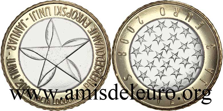 Descriptif avers : L'avers représente une étoile "dynamique" EU sous la forme d'un moulin à vent. Cette étoile représente l'initiative de la Slovénie, le mouvement, l'énergie, la volonté, la force et le rôle actif pendant la présidence de l'Union Européenne. Il y a une inscription sur la pièce, "Facta loquuntur" ( "les œuvres parlent"), indiquant les résultats et les succès. Au verso, 27 étoiles dynamiques, une pour chacun des 27 États membres de l'Union Européenne.
