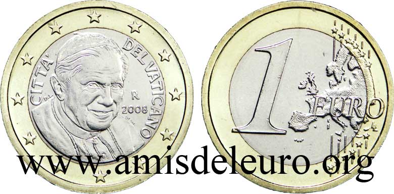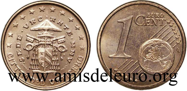 Descriptif avers : Dans la couronne, les douze étoiles de la Communauté européenne. Au centre de la gravure, le buste du souverain pontife, Benoît XVI, qui a succédé à Jean Paul II. Autour de la tête du pape, de 9 heures à 4 heures, la mention "CITTÁ DEL VATICANO". La marque d'atelier "R" est visible à droite, à 3 heures, au dessus du millésime. À gauche, au dessus de l'épaule du pontife, les initiales du concepteur "DL" pour Daniela Longo. À droite, au dessus de l'épaule, les lettres ELF INC., signature du graveur de la pièce, Ettore Lorenzo Frapiccini.