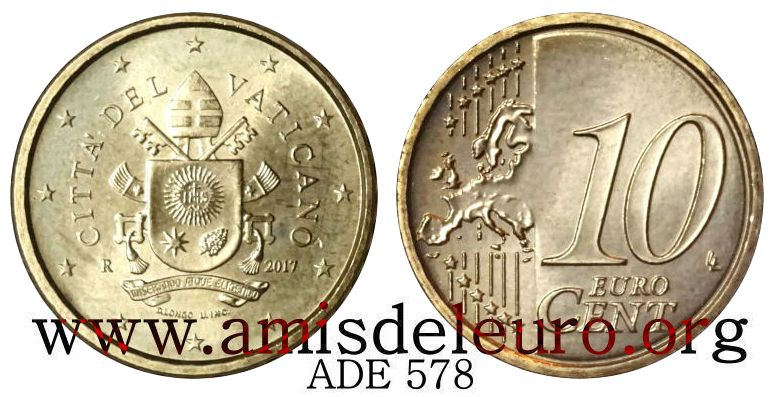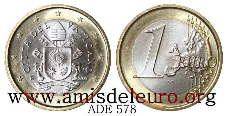 Descriptif avers : Le dessin représente les armoiries du souverain de l’État de la Cité du Vatican, le Pape François. La marque d’atelier «R» figure dans la partie inférieure gauche, et l’année d’émission «2017» dans la partie inférieure droite.