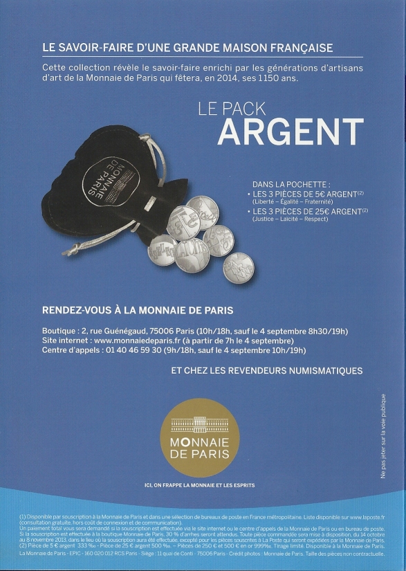 Après les pièces Liberté, Égalité, Fraternité, Justice, Laïcité, Respect et Paix, l’Euro de la République symbolise l’incarnation de toutes ces valeurs réunies. Prestigieuse par sa composition en or pur 999 ‰ et son tirage limité, cette monnaie se présente comme un objet rare, reflet du savoir-faire multiséculaire des ateliers de la Monnaie de Paris installés au cœur de la capitale, qui fêteront en 2014 leur 1150è anniversaire.