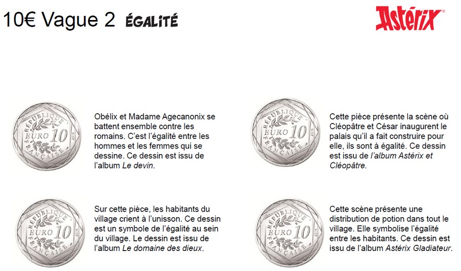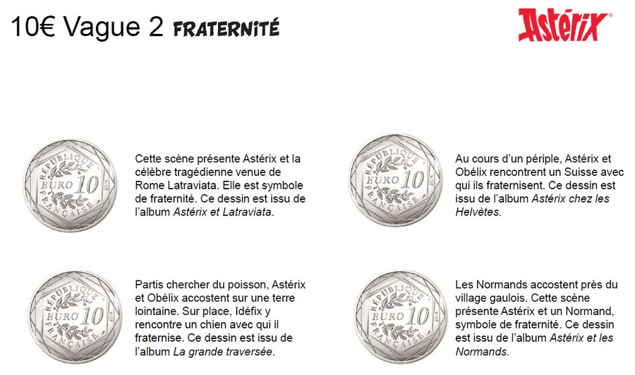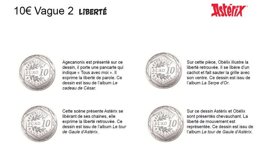 La collection est composée de 24 modèles de 10 euros Argent (333 milièmes), mettant en scène un ou plusieurs personnages de la fameuse bande dessinée . Vendue avec une cartelette qui reprend son dessin en couleur, chaque pièce est tirée à 125 000 exemplaires. A cette occasion, La Monnaie de Paris va lancer une importante campagne de communication nationale à destination du grand public.