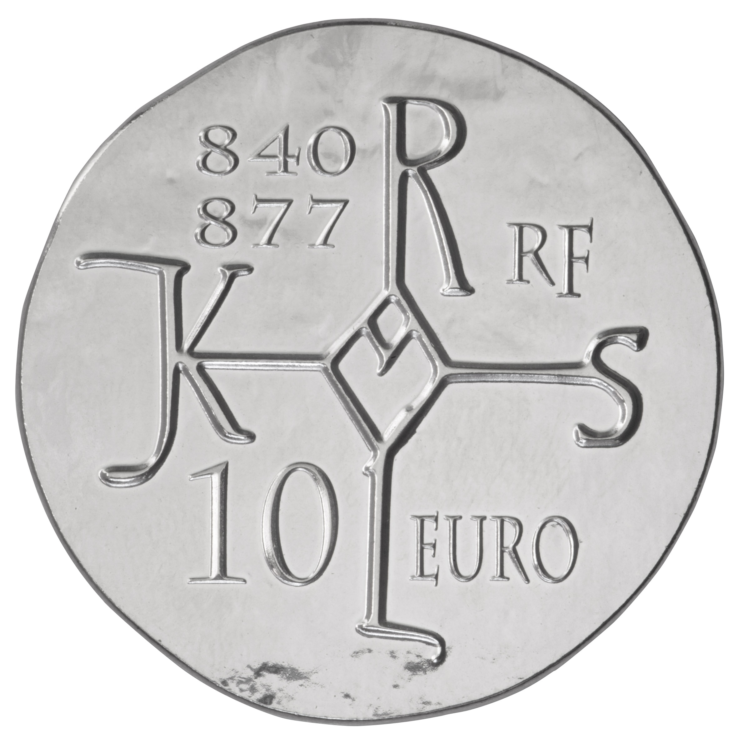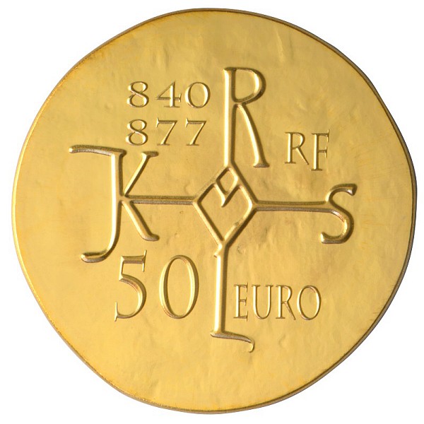 Charles II dit "Le Chauve" (823-877) créa la loi autorisant l’Etat à battre monnaie. Son édit de 864 est fondateur de la Monnaie de Paris. Sur l'avers, Charles le Chauve est représenté avec son sceptre, entouré de son nom. La signature royale de Charles le Chauve comprenant son denier et ses dates de règne (843–877) apparaissent sur le revers.