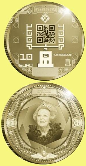 Les pièces de 5 et 10 euros seront en argent et en or. Le QR code, vous redirigera sur ce site http://www.q5g.nl/