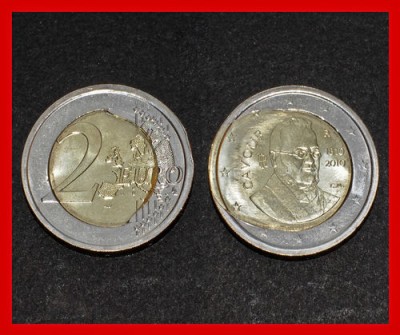 Trouvée par l'un de nos adhérents, Spirou, une 2€ commémorative italienne CAVOUR avec une frappe décentrée ou "Spiegelei" comme disent nos amis allemands.