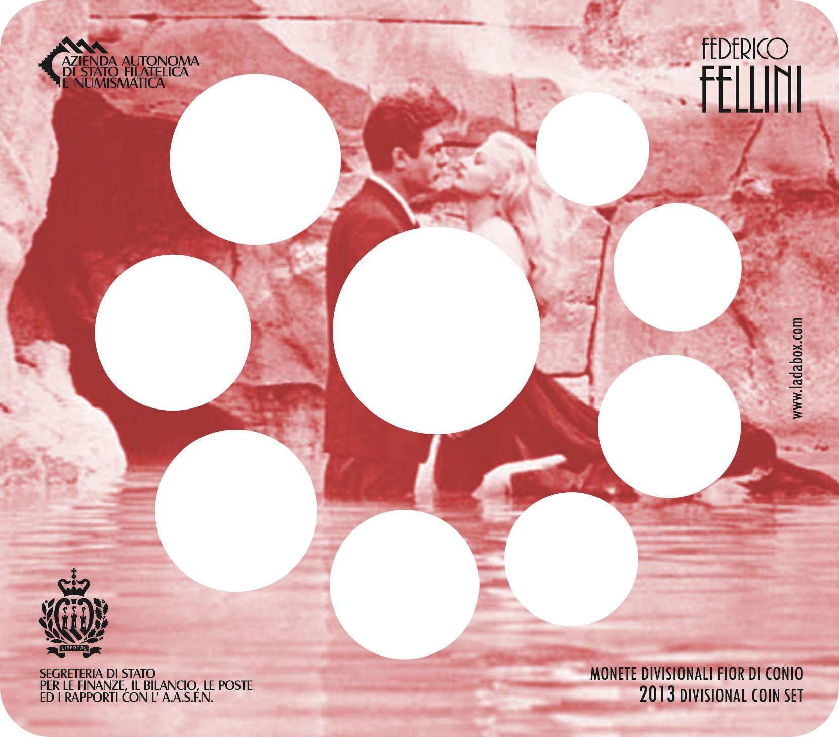 - un set contenant une série divisionnaire ( 1 cent - 2 euros) ainsi qu'une pièce de 5€ en argent. La pièce et le coffret commémorent Frederico FELLINI. Il a été émis à hauteur de 30 000 exemplaires.