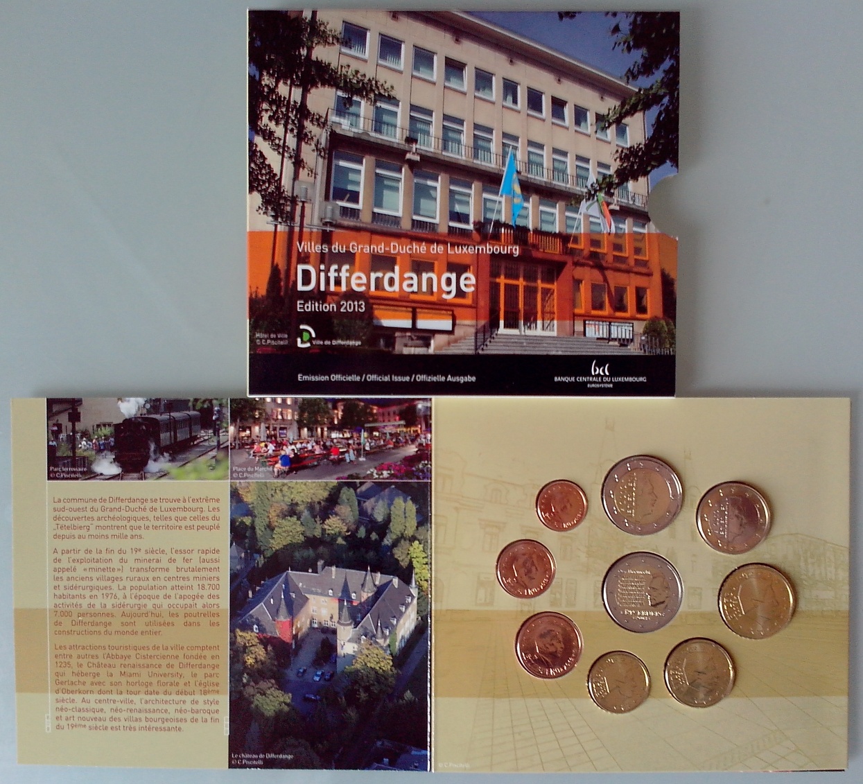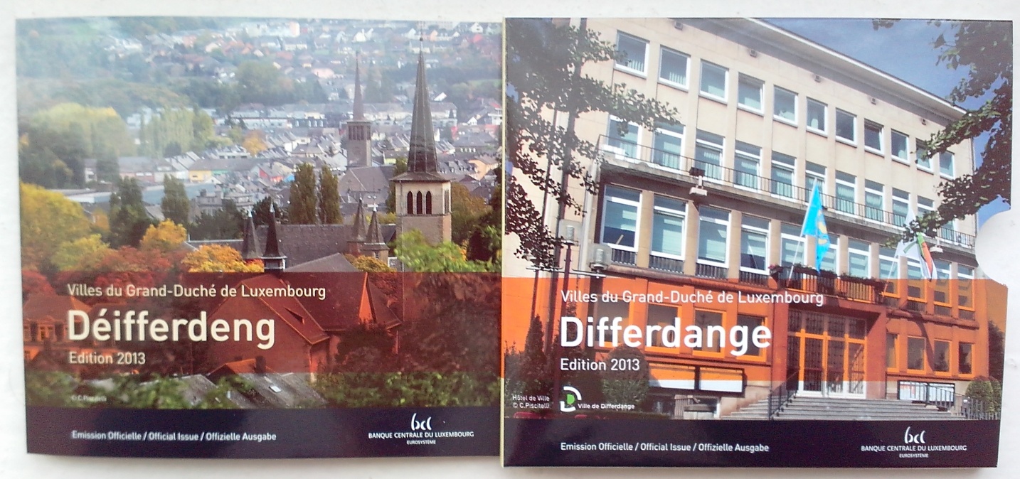 - Un set BU dédié à la ville de Differdange fabriqué à 7.500 exemplaires numérotés avec les 8 pièces courantes et une 2 € CC en qualité BU. Il est vendu au prix de 30 €.