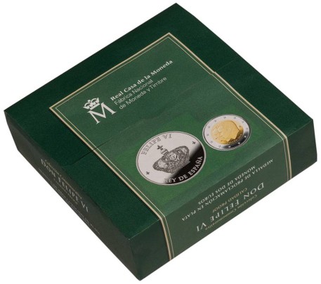 Un porte-folio avec la 2 € du Roi Juan Carlos et la nouvelle commémorative de 2 euros "Proclamation du roi Philippe VI", datées 2014.