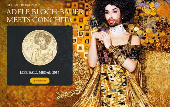 Cette médaille fusionne deux personnages célèbres: Adele Bloch-Bauer, immortalisée dans le célèbre tableau de Klimt, et Tom Neuwirth, immortalisé dans son alter ego, Conchita Wurst.